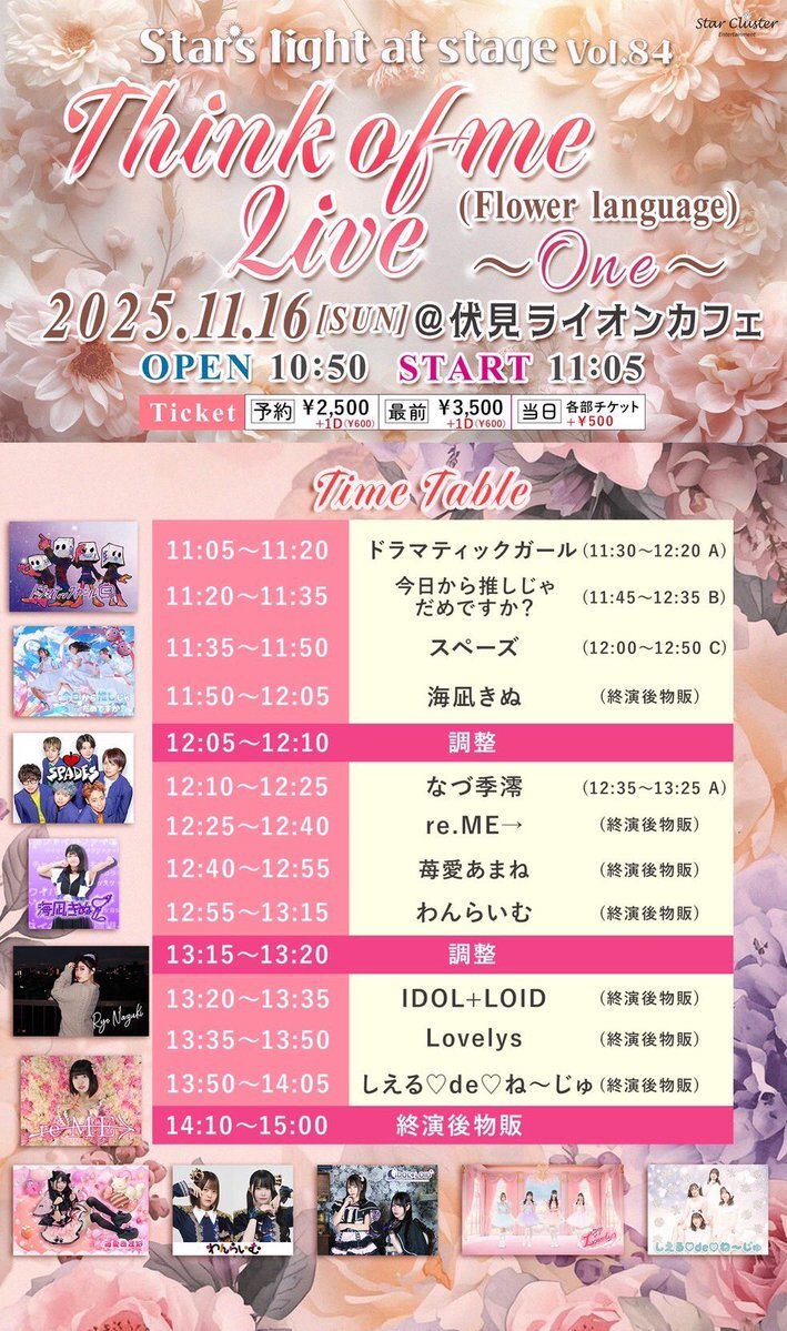 ♯. #ラブズLIVE予定⌇ 2025/11/16(日) Star’s light at Stage Vol.83&84 〜 Think of me Live (Flower language) One〜 @ 伏見ライオンカフェ 🎟️ 予約¥2,500/最前¥3,500(+1D) 🕰 出演13:35-13:50/終演後物販 🎫 tiget.net/events/437707 🕰 出演16:50-17:10/並行物販 🎫 tiget.net/events/437708
