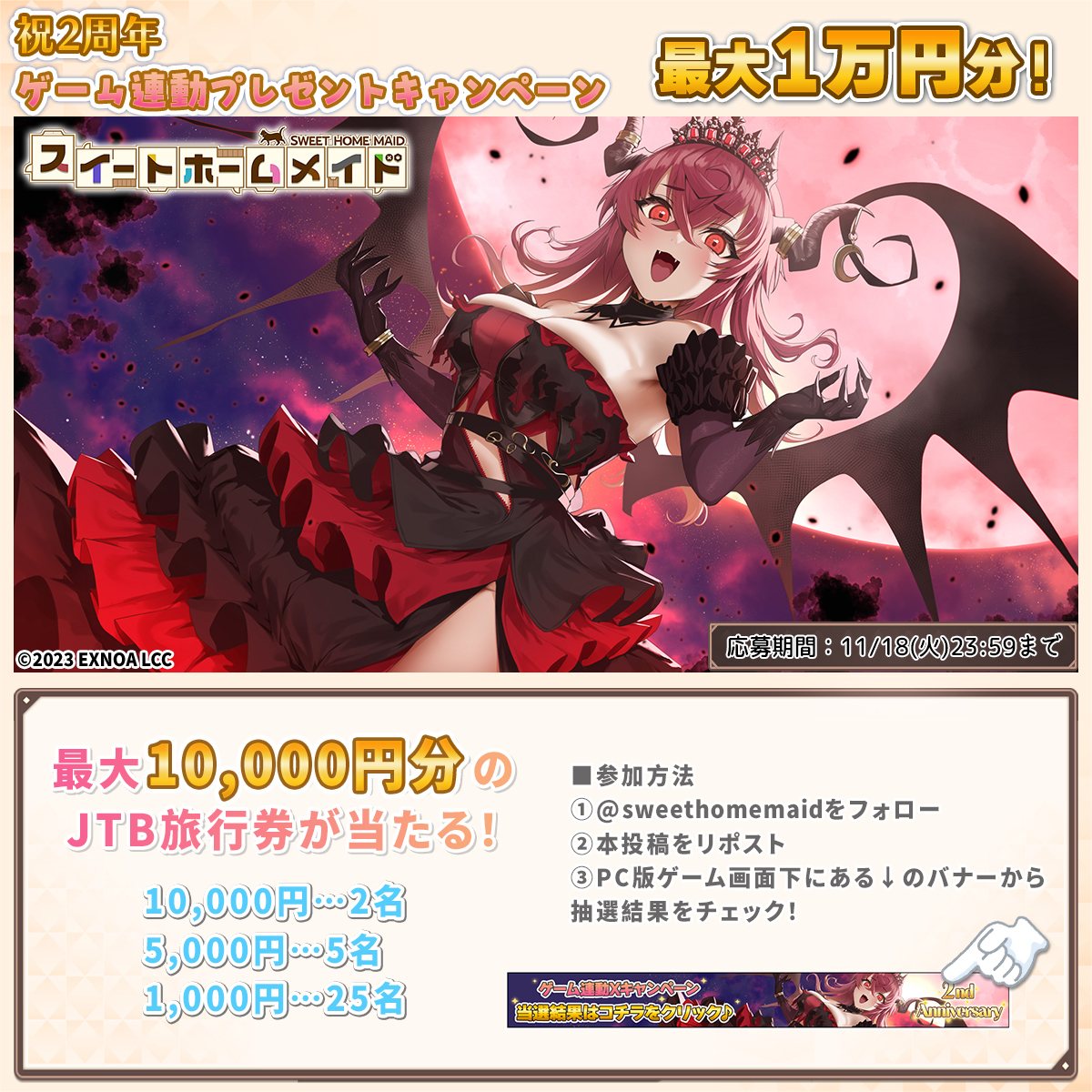 #スイメド 2周年記念  ゲーム連動プレゼントキャンペーン 🎉◢ 2周年を記念して #JTB旅行券 最大1万円をプレゼント🎁 参加後すぐに結果がわかる! 参加方法 ①@sweethomemaid をフォロー ②本投稿をリポスト ③PC版ゲーム画面下にあるバナーから 抽選結果をチェック! 〆11/18(火)23:59 pic.x.com/2OsECTnzWy