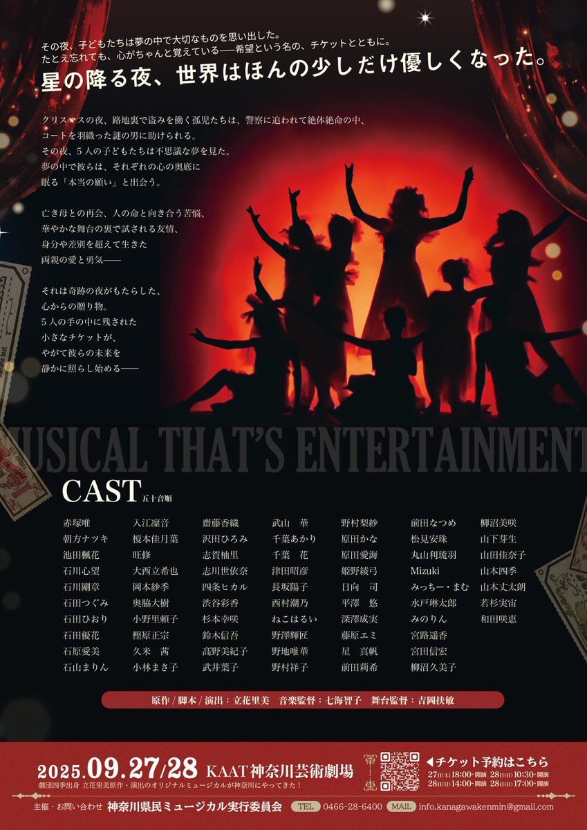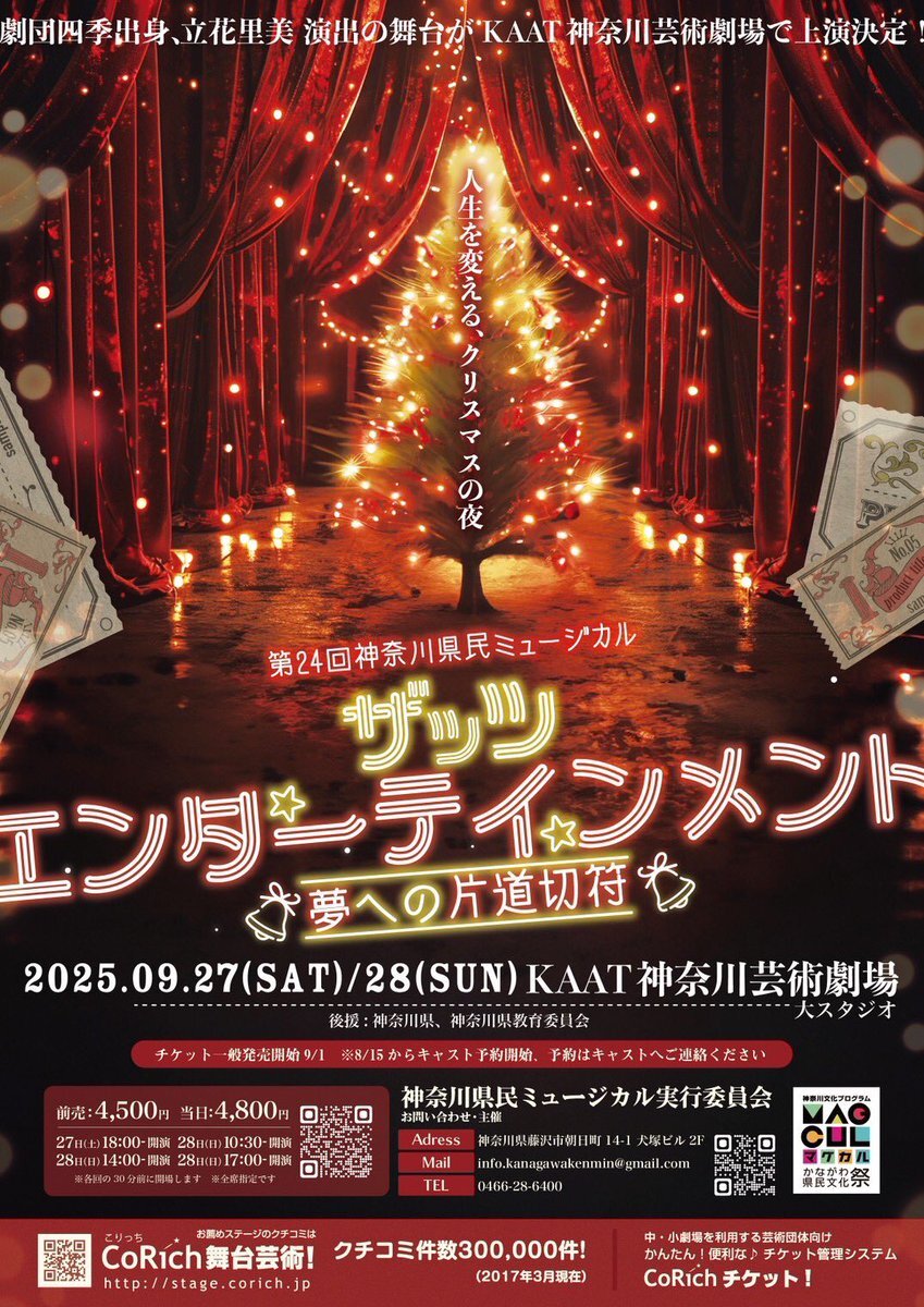 ✨️出演情報✨️ 第24回神奈川県民ミュージカル 「ザッツ・エンターテイメント~夢への片道切符~」 劇場:KAAT神奈川芸術劇場大スタジオ 料金:4,500円(前売)、4,800円(当日) 日程公演スケジュール 9月27日(土) 18:00~ Aチーム 9月28日(日) 10:30~ Bチーム 14:00~ Aチーム 17:00~ Bチーム