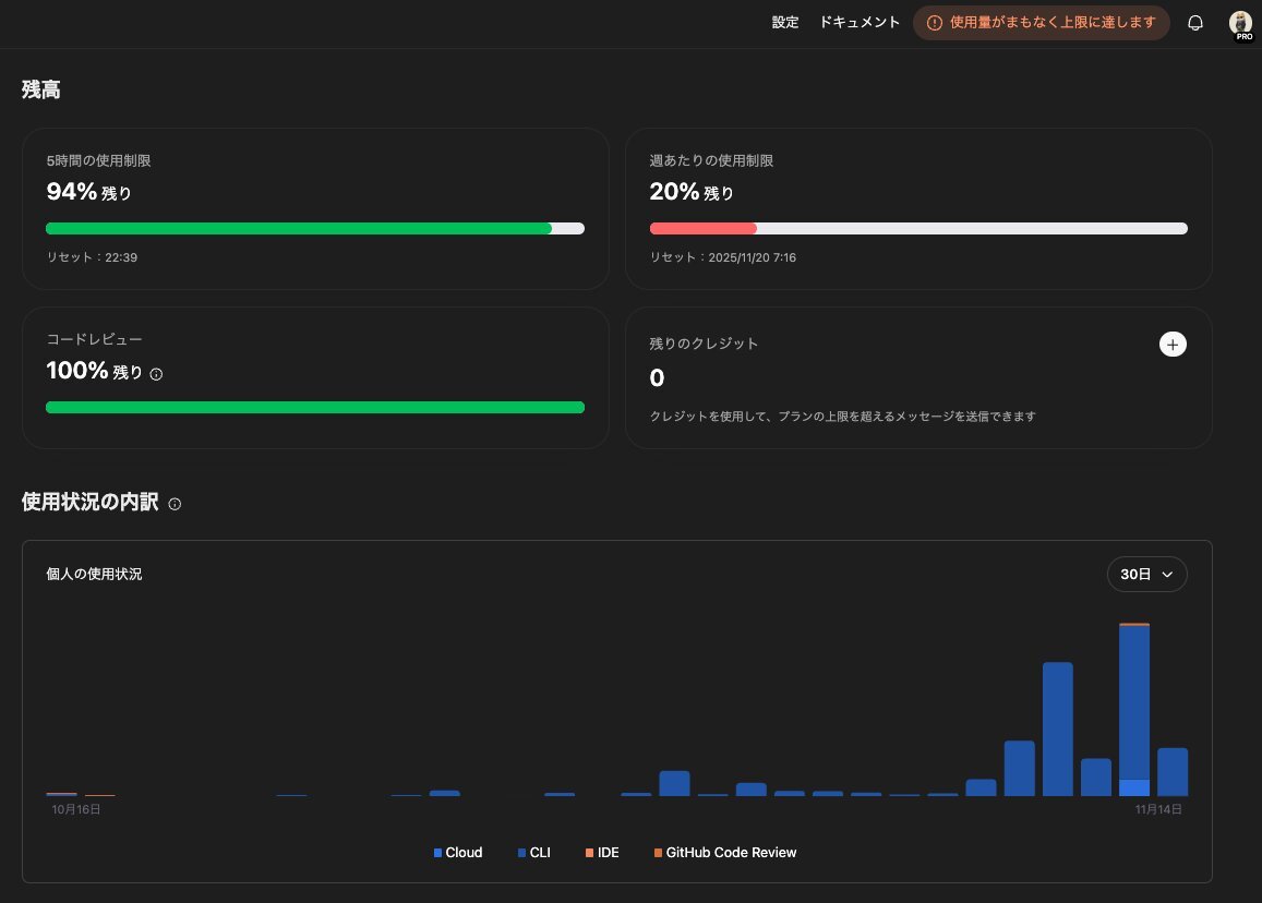 KamuiOSをリリースしてからのCodexの使用量が半端なくていつの間にか週リミット残り20%...(11/20😱) #kamuios 身銭切ってプロプラン使ってこれですよ、、 並列の力がすごすぎなんだ🤖 確かに、最適化が課題だけど自分の最適化も必要だこれは。 pic.x.com/3qFThCM9dp
