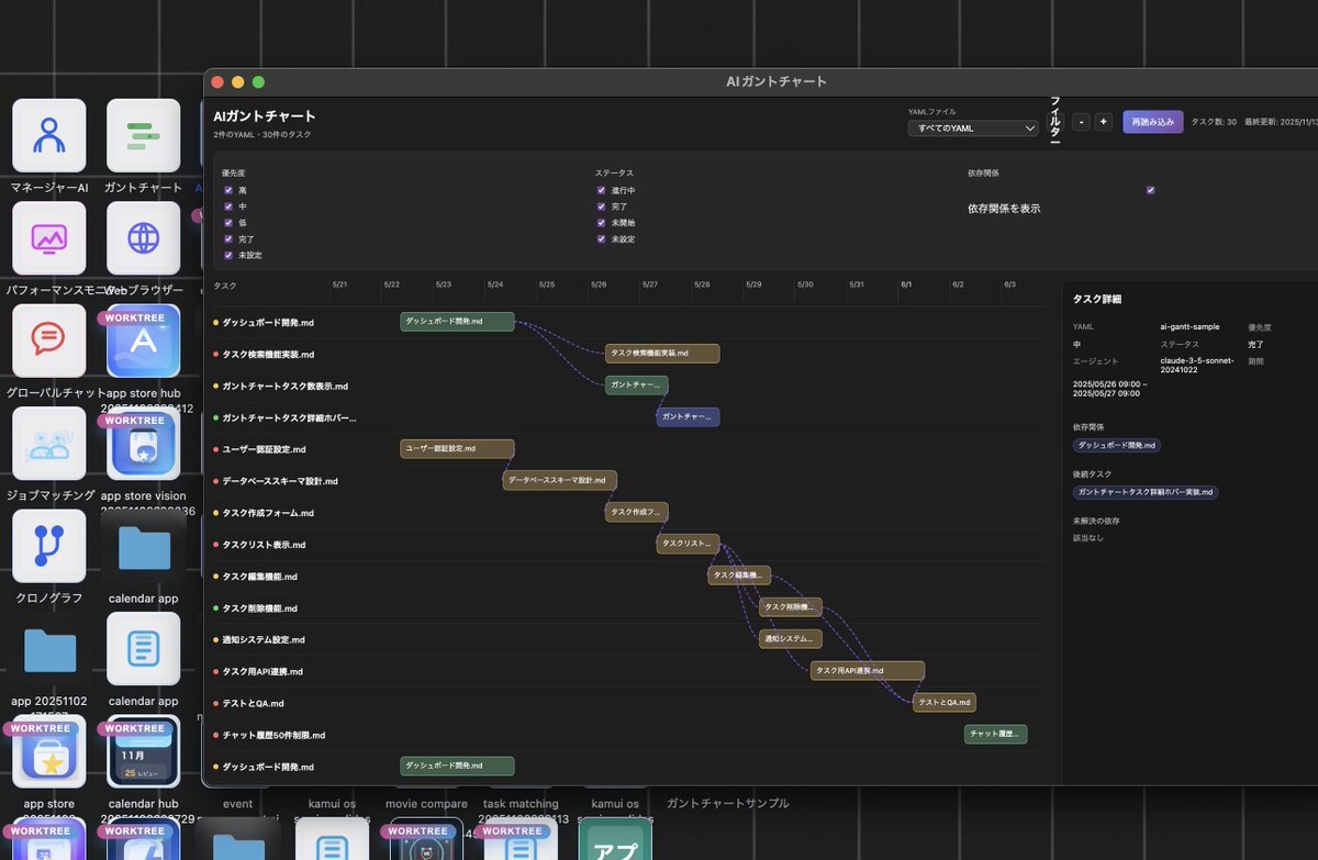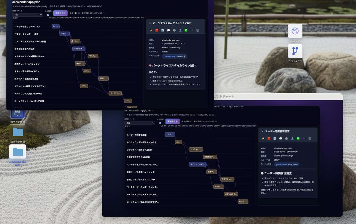 UIとかは粗々やけど、とりあえず機能は出来たんで次のリリースに入れますね👋 「ガントチャート生成」 Microsoft論文の非同期シンキングに向けた第一歩です。 #kamuios pic.x.com/HZirTQYXN3