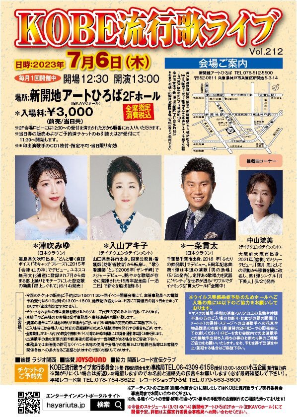 【告知】7月6日(木) KOBE流行歌ライブ 【時間】 (開場)12:30 (開演)13:00 【場所】 新開地アートひろば2Fホール (神戸市兵庫区新開地5丁目3番14号) 【入場料】3000円 【お問合せ】 KOBE流行歌ライブ TEL06-4309-6158 ※中山琉美は推薦曲コーナーに出演させて頂きます #KOBE流行歌ライブ #推薦曲 pic.x.com/igLoUxbSub