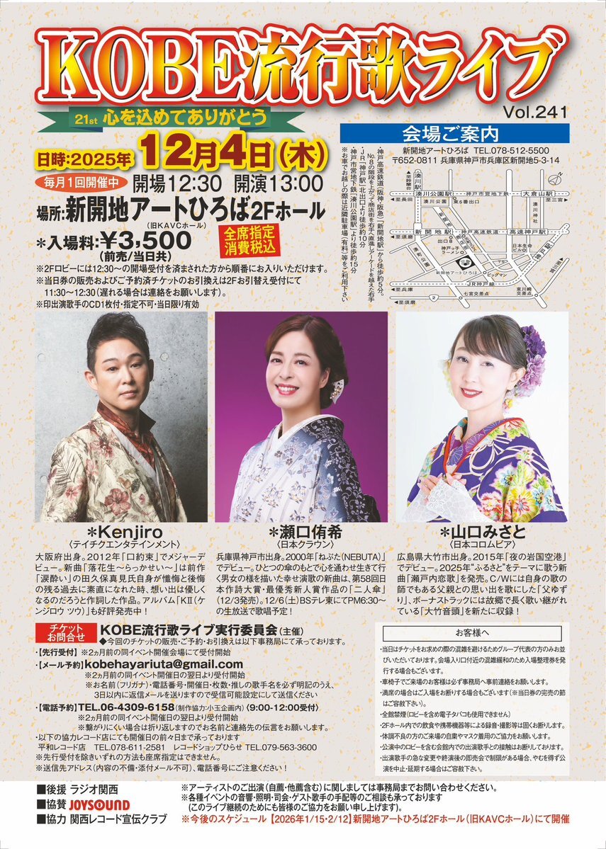 #KOBE流行歌ライブ #新開地アートひろば 12月4日(木)13時開演 入場料¥3,500 敬称略 出演者 #瀬口侑希 #kenjiro #山口みさと 1月15日(木) #岡田しのぶ #伊達悠太 #知里 #惠谷昌史 おはようございます 6時37分 11/15(土)神戸 気温8℃ pic.x.com/1O4P2qGYpC