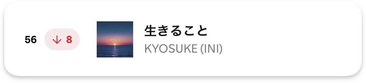 🟢Spotify Viral Songs Japan🇯🇵 前日4️⃣8️⃣→5️⃣6️⃣位⤵️ 8ランクダウン💦😭 KYOSUKE(INI)-生きること 2025.11.16 Total days on chart26 streak11 promocards.byspotify.com/api/share/df45… #Spotify_INI #INI #INI_STUDIO #藤牧京介 #FUJIMAKIKYOSUKE #KYOSUKE生きること