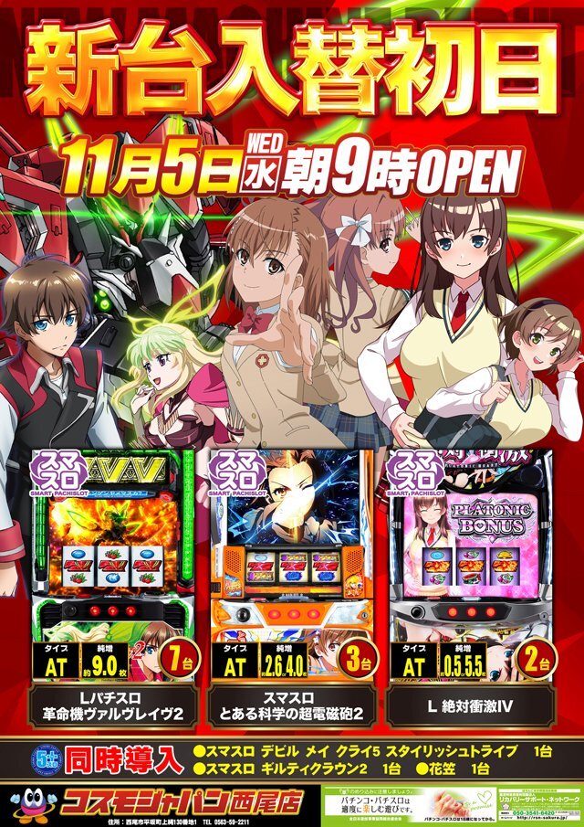 おはようございます☀️ #コスモジャパン西尾店 です🐏 本日11月5日(水) 新台が朝から打てる‼️ 新台入替初日✨ 朝9時開店☀️ 新台3機種12台導入完了‼️ #Lヴァルヴレイヴ2 #Lとある科学の超電磁砲2 #L絶対衝撃フォース 今週のおすすめ機種(11/3~11/9)🐸🌈 #モンキーターン #ゴッドイーター pic.x.com/WgKGxGUPK8