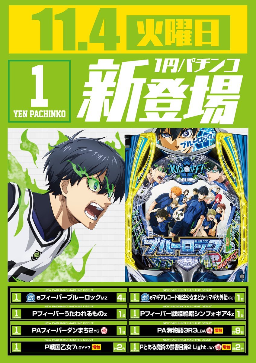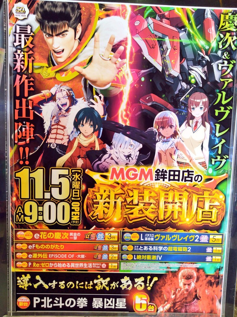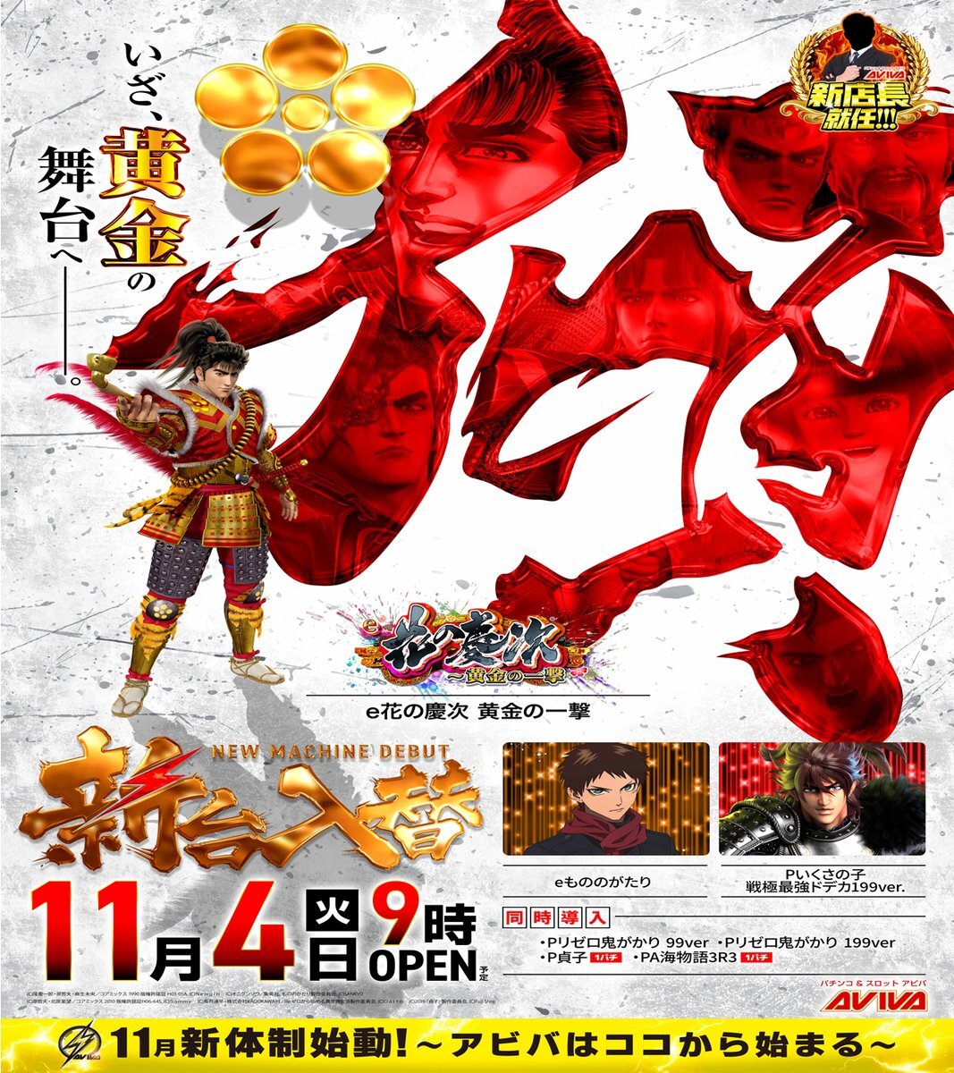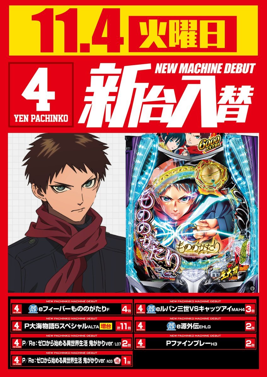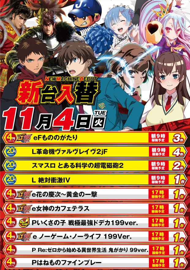 🎊1⃣1⃣月4⃣日🎊 🌈#新台入替 🌈 🟢パチンコ🟢 #e花の慶次~黄金の一撃 #eフィーバーもののがたり #Pいくさの子戦極最強 🔴スロット🔴 #L革命機ヴァルヴレイヴ2 #Lとある科学の超電磁砲2 #L絶対衝激フォース 新台抽選は11:30からです👍 是非最新台は #アビバ で‼️‼️ pic.x.com/GOBWLKEpeG