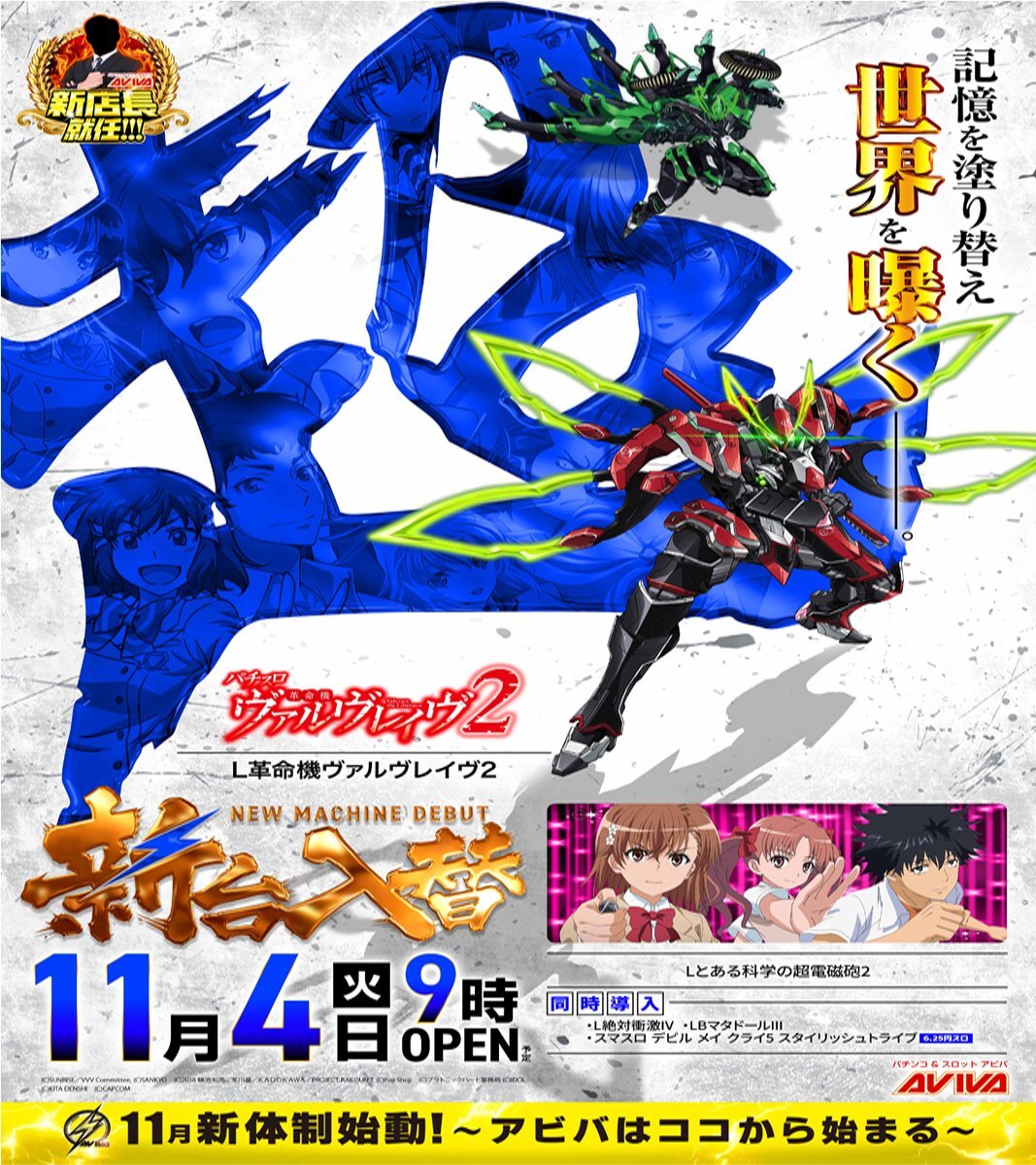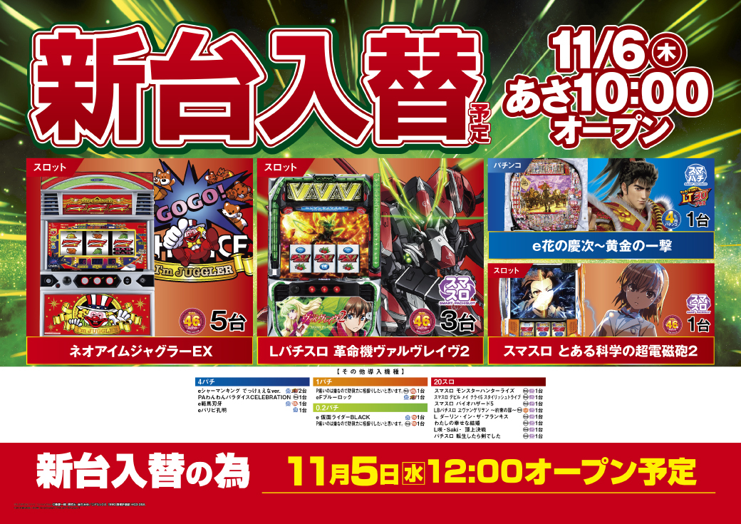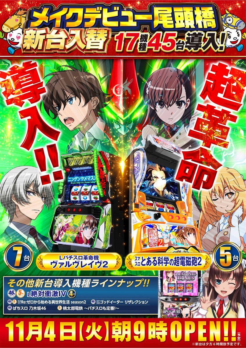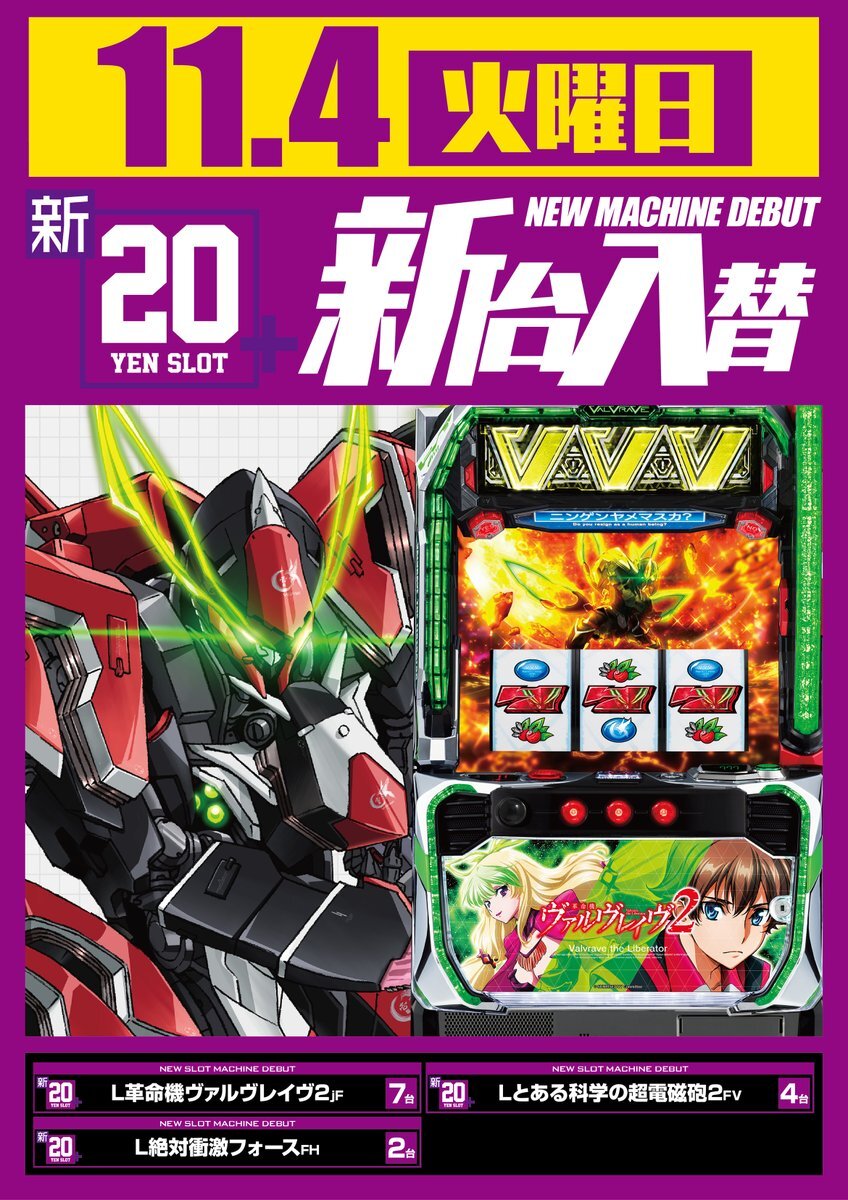 こんばんわ☺ 11月6日(木)新台入替❤❤❤ #ネオアイムジャグラー 5台、#Lヴァルヴレイヴ2 3台 #Lとある科学の超電磁砲2 1台など、多数導入❤❤❤ 明日11月5日は新台入替のため、12時オープンとなります❗❗ pic.x.com/nIoD0X2c6T
