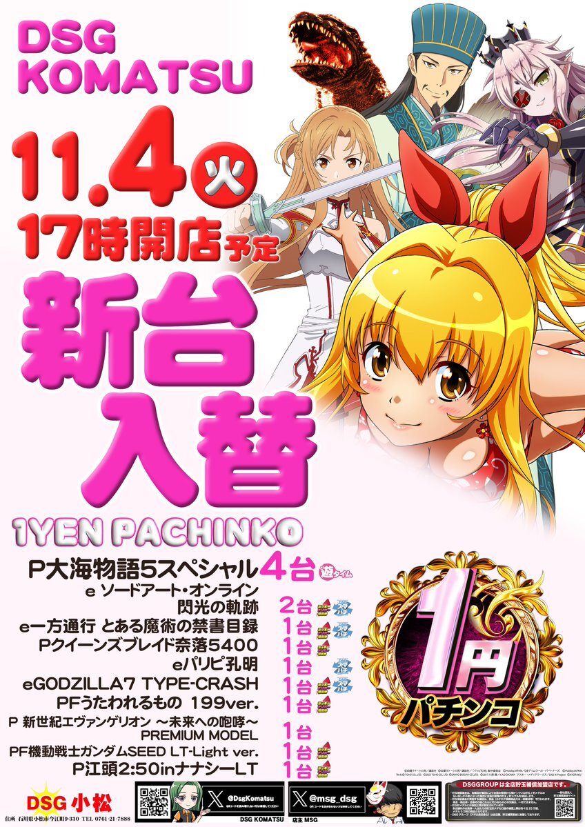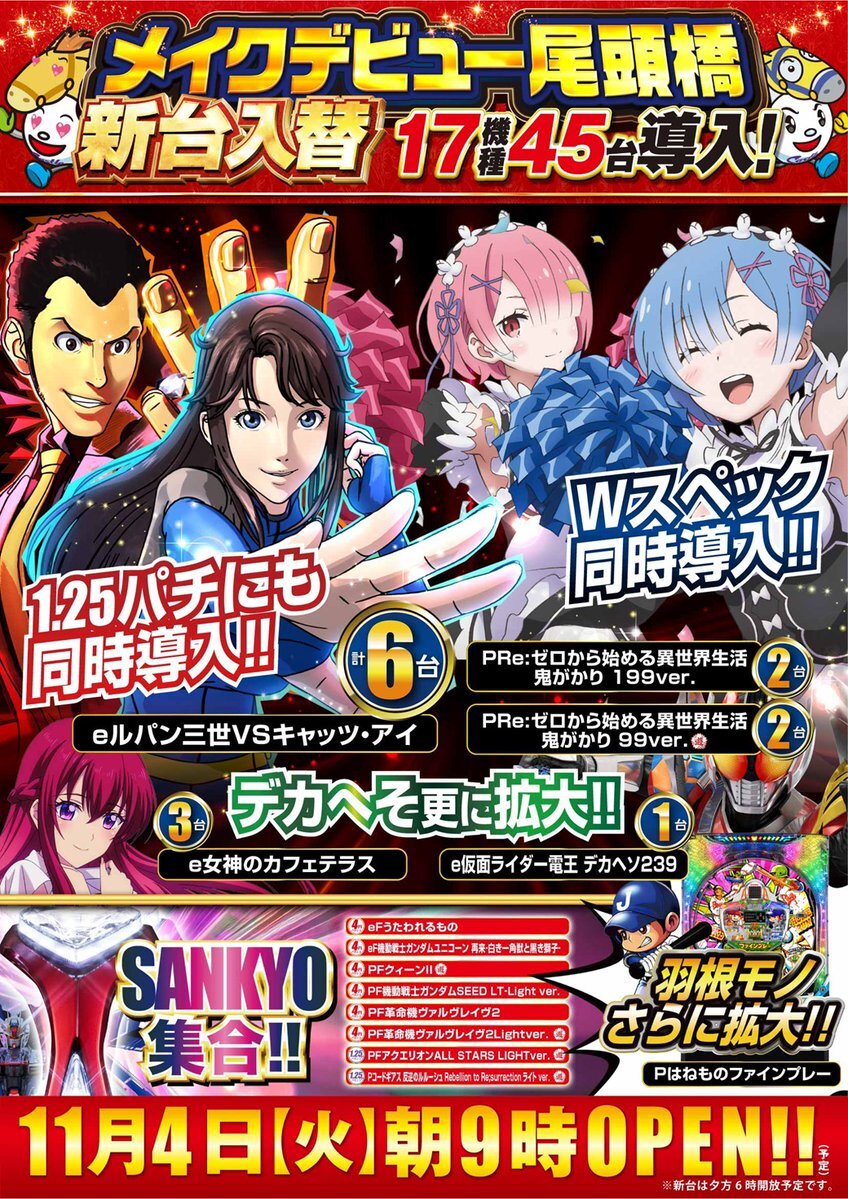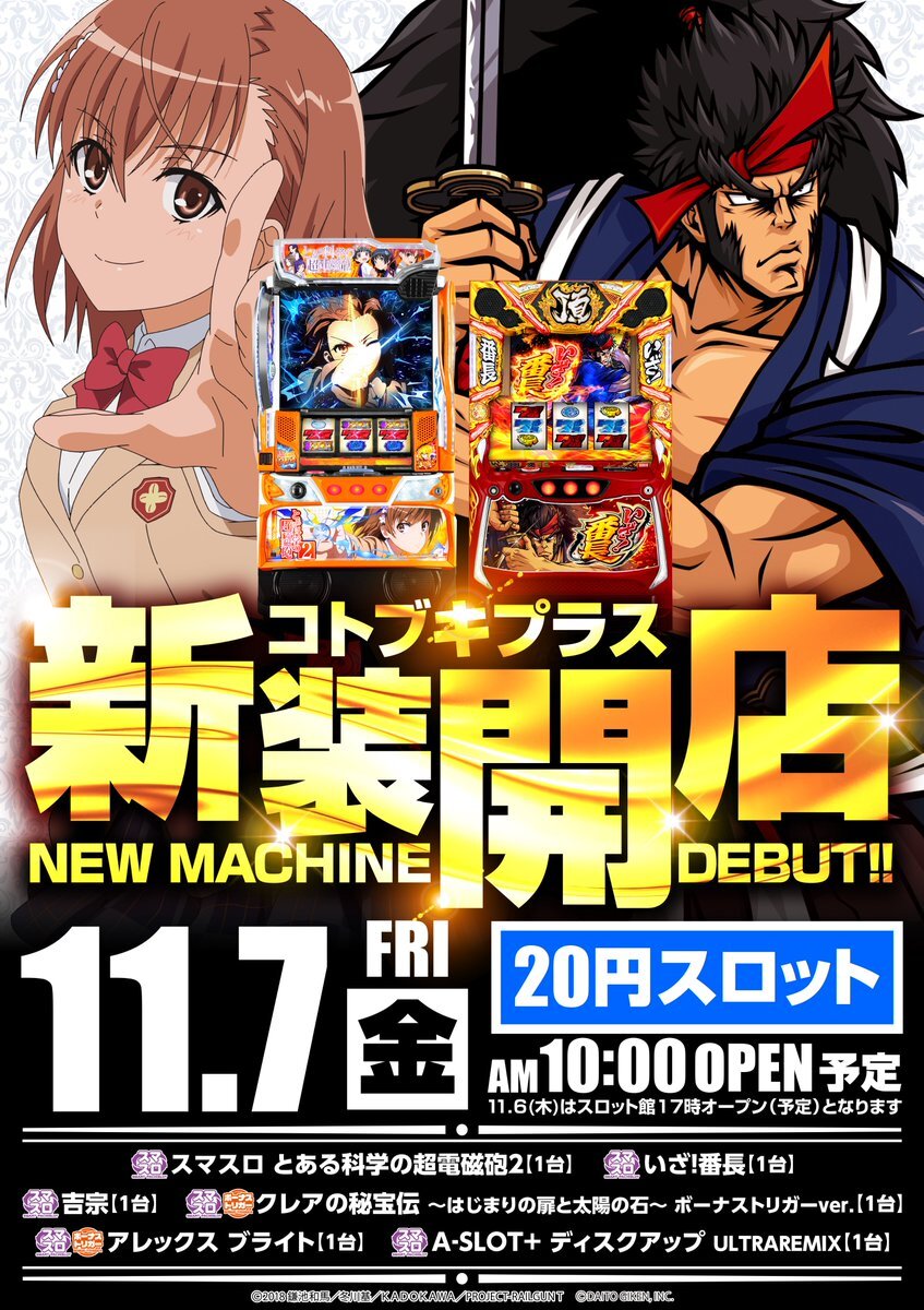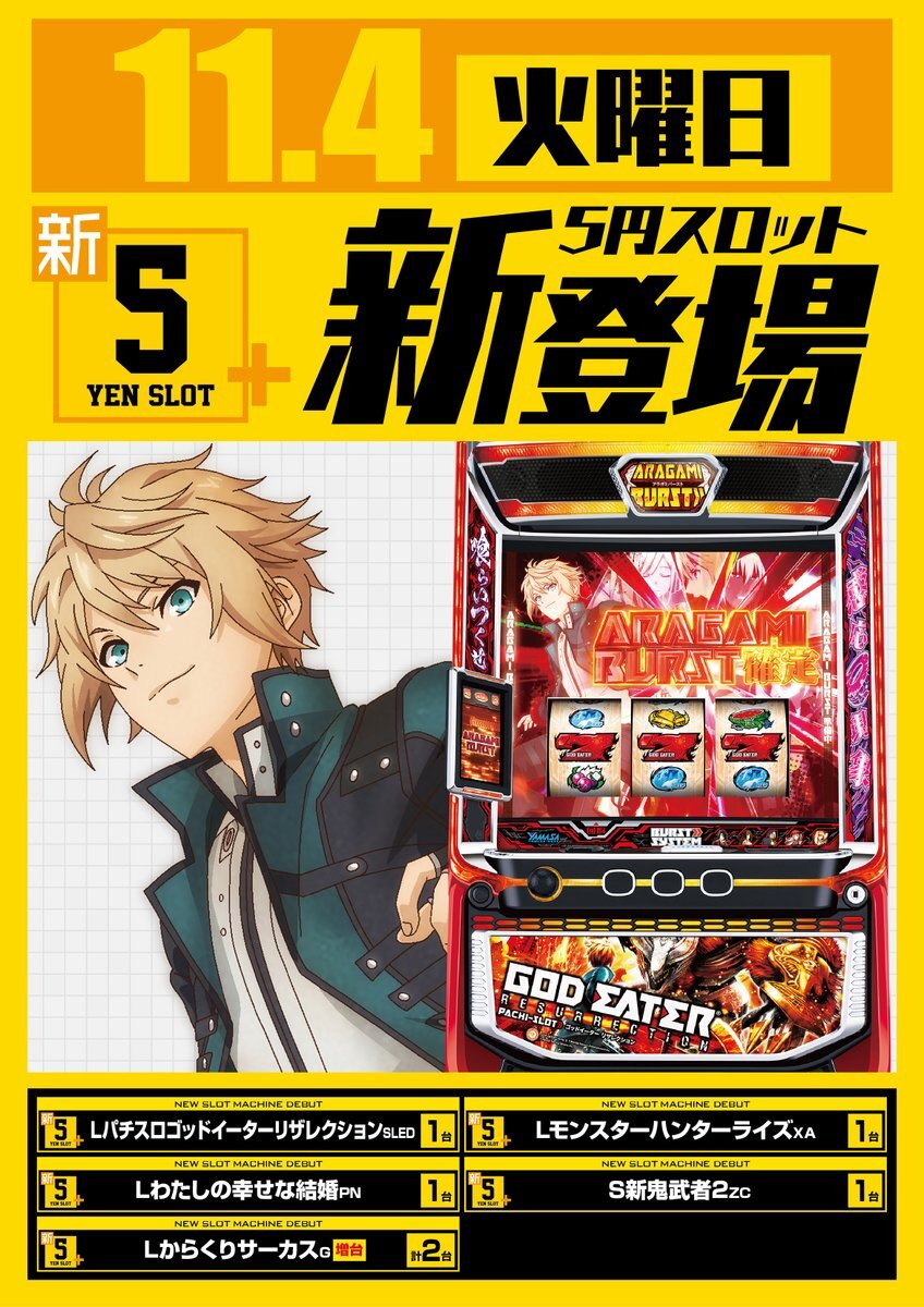こんばんわ☺ 11月6日(木)新台入替❤❤❤ #ネオアイムジャグラー 5台、#Lヴァルヴレイヴ2 3台 #Lとある科学の超電磁砲2 1台など、多数導入❤❤❤ 明日11月5日は新台入替のため、12時オープンとなります❗❗ pic.x.com/nIoD0X2c6T
