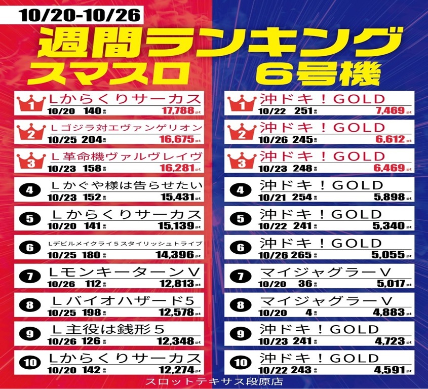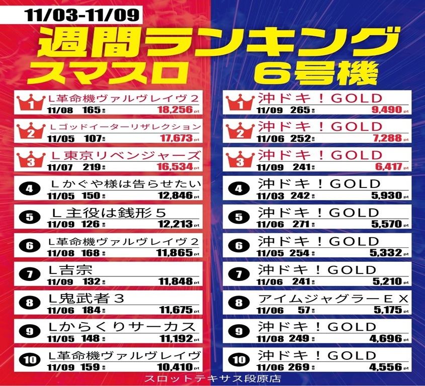こんにちは♪ スロットテキサス段原店です😀 昨日の万枚overです!! #L主役は銭形5 1台 #L吉宗 1台 #L革命機ヴァルヴレイヴ 1台 週間ランキング更新しました 🧐 是非台選びの参考にしてください♪ ↓データ確認はこちらから↓ pscube.jp/dedamajyoho-P-… pic.x.com/etB4nGBSrt