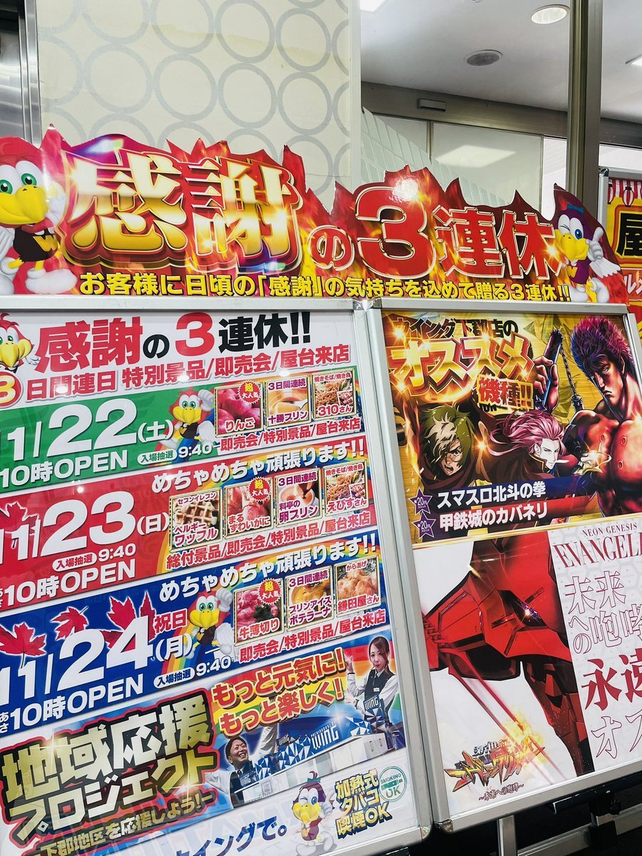 おはようございます☀️ 22日(土)🔥10時OPEN🔥 ⭐️おすすめ機種 #エヴァ咆哮 #L北斗の拳 #カバネリ ⭐️22日〜24日の3日間 #特別景品 販売 & #即売会 連日開催❣️ 特別景品はプリン食べ比べ! 本日の即売会の品は #りんご🍎 ⭐️屋台焼きそば焼鳥の310さん来店 🤍3連休もウイング下郡店へ🤍 pic.x.com/GtM4DIzosf