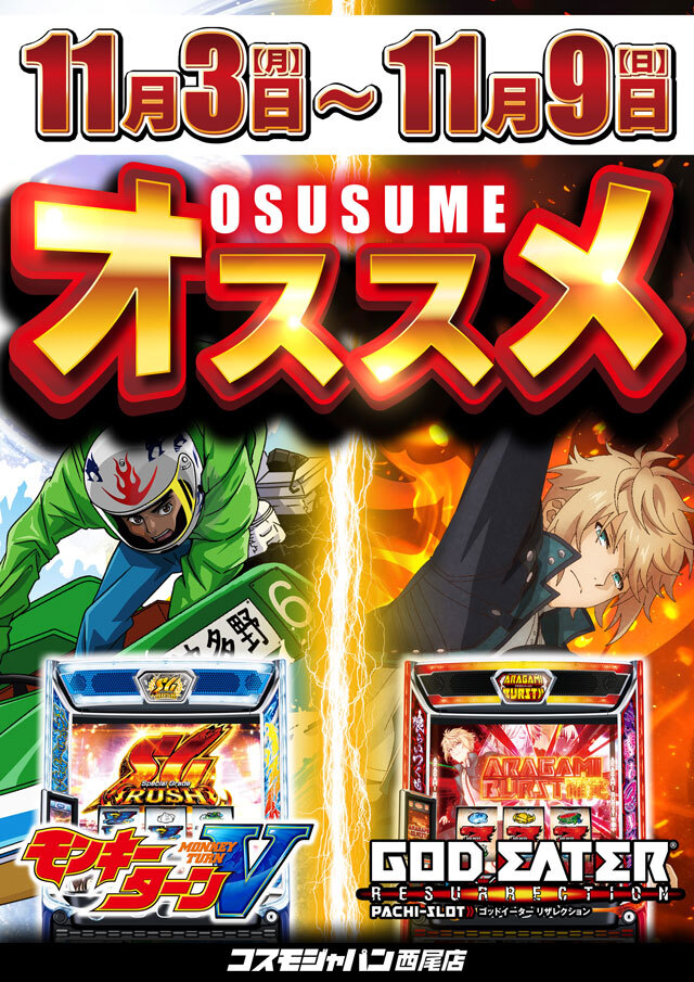 おはようございます☀️ #コスモジャパン西尾店 です🐏 本日11月8日(土) ✨新台導入完了 #Lヴァルヴレイヴ2 #Lとある科学の超電磁砲2 #L絶対衝撃フォース 🐸今週のおすすめ機種(11/3~11/9) #Lモンキーターン #Lゴッドイーター 🧟‍♂️今月もおすすめ機種 #L東京喰種 ご来店お待ちしております🐏 pic.x.com/BMOnJipX9n