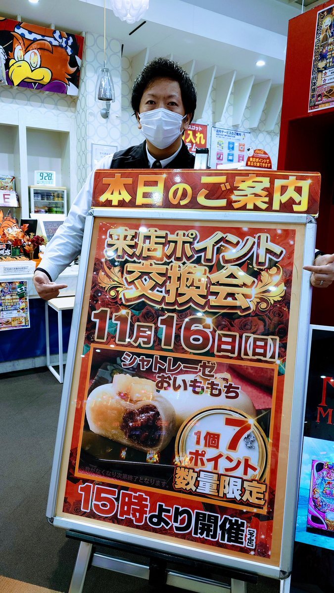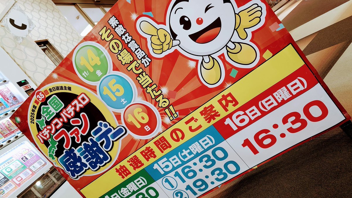 おはようございます☀️ 11.11日(火)🔥10時open🔥 今日は #ポッキー の日ですね♥️ おすすめ機種✨ #エヴァ #e東京喰種 #L東京喰種 技術介入コーナーもおすすめ✨️ #第35回全国パチンコパチスロファン感謝デー の豪華景品、店内に並んでおりますっ❣️❣️❣️ 14日(金)〜16日(日)の3日間開催✨️ pic.x.com/7sOIOEgKer