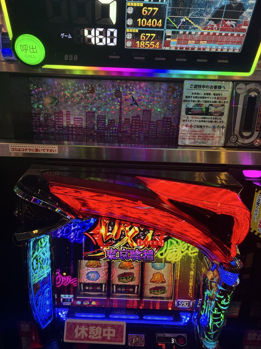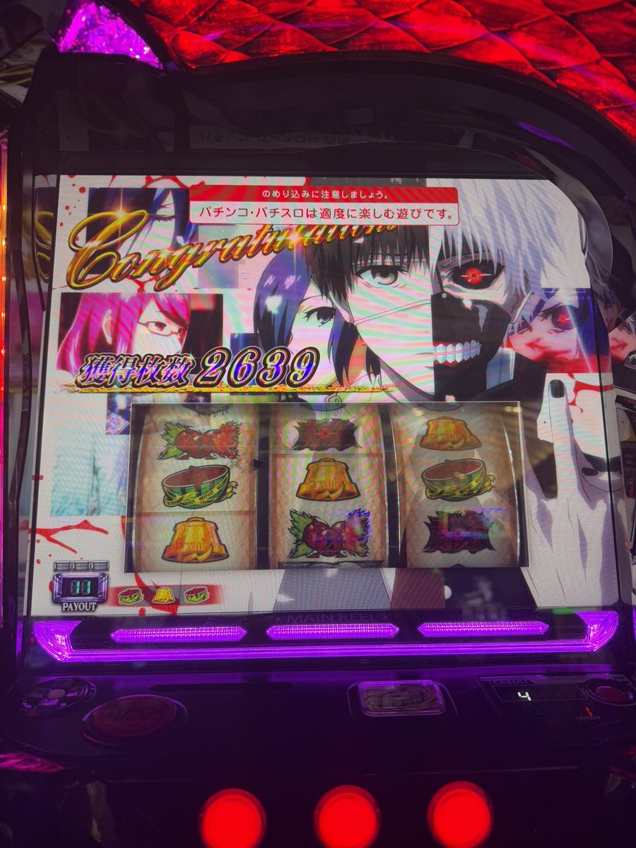 今日1000Gも回してなくて直撃ひいて赫眼も引いて でもATは確定バイツの1回だけ 赫眼直後に超高確でチェリーは2回だけ、 しかも当たらない あたりにも適正がない #L東京喰種 #バトル中の抽選は嘘ばっかし