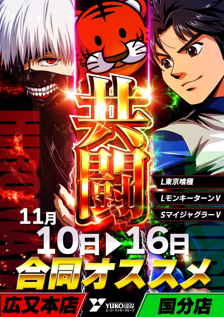 こんばんは🌙 明日10日(月)AM10時OPEN❣ 抽選開始時間⏰9:50 ✅#ぽにでこ 取材💘   🔥🔥共闘🔥🔥 【広又本店】⚔️【国分店】   ✨合同オススメ✨ ✅#L東京喰種🧌 ✅#LモンキーターンV🚤 ✅#SマイジャグラーV🤡 #週のハジマリ もご来店お待ちしております🙇‍♂️ pic.x.com/5Ew9xxMqyg