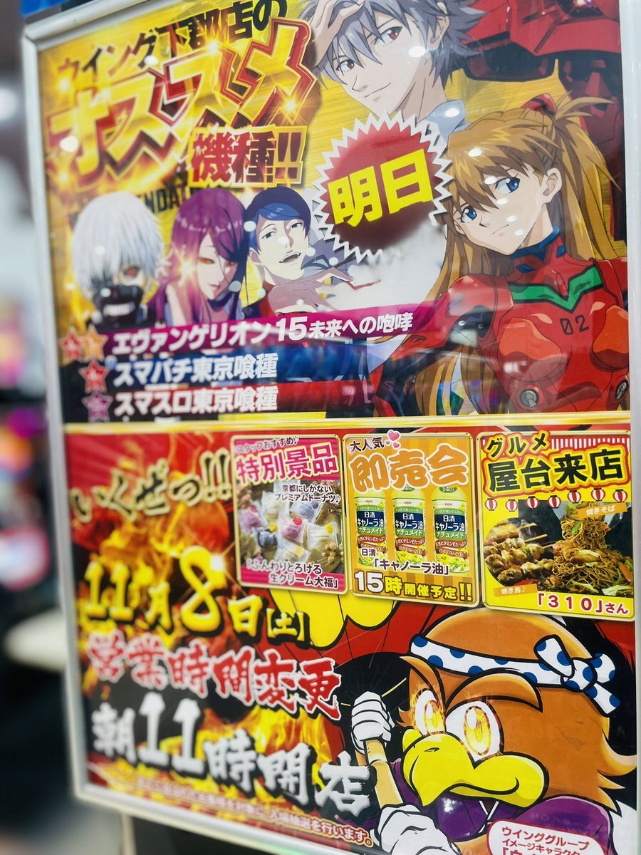 おはようございます☀️ 8日(土)🔥営業時間変更11時open🔥 🌟おすすめ機種 #エヴァ咆哮 #e東京喰種 #L東京喰種 🌟屋台焼きそば焼鳥の310さん来店! 🌟特別景品 #ふんわりとろける生クリーム大福 入荷! 🌟11.6〜新台入替オープンしてます! 🌟即売会開催!本日は #キャノーラ油 です! pic.x.com/75iqWNGQyj