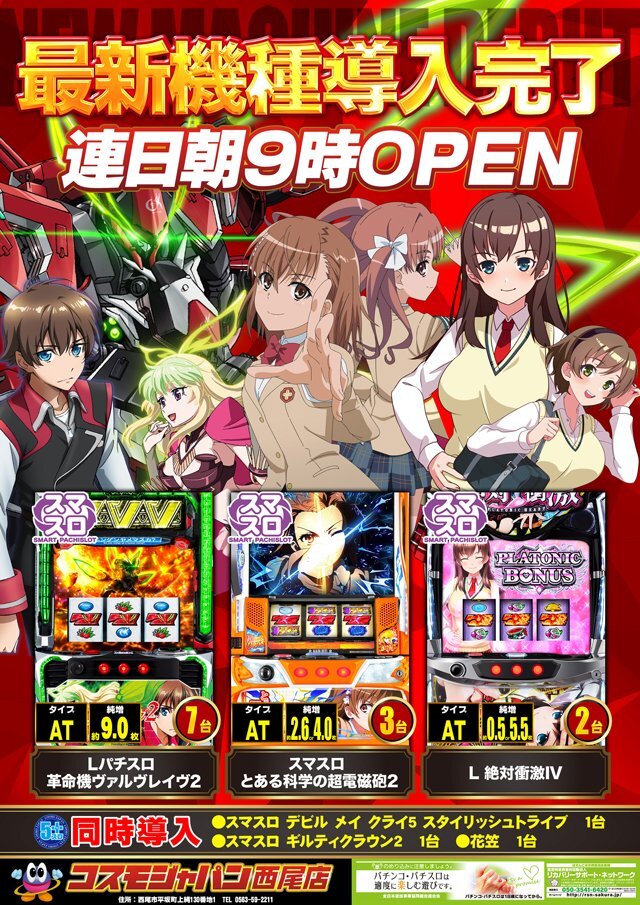 おはようございます☀️ #コスモジャパン西尾店 です🐏 本日11月11日(火) ✨新台導入完了✨ #Lヴァルヴレイヴ2 #Lとある科学の超電磁砲2 #L絶対衝撃フォース 👊今週のおすすめ機種(11/10~11/16)🧙‍♂️ #L東京リベンジャーズ #Lマギアレコード 🧟‍♂️今月もおすすめ機種🧟‍♂️ #L東京喰種 pic.x.com/6pjsibYNqM