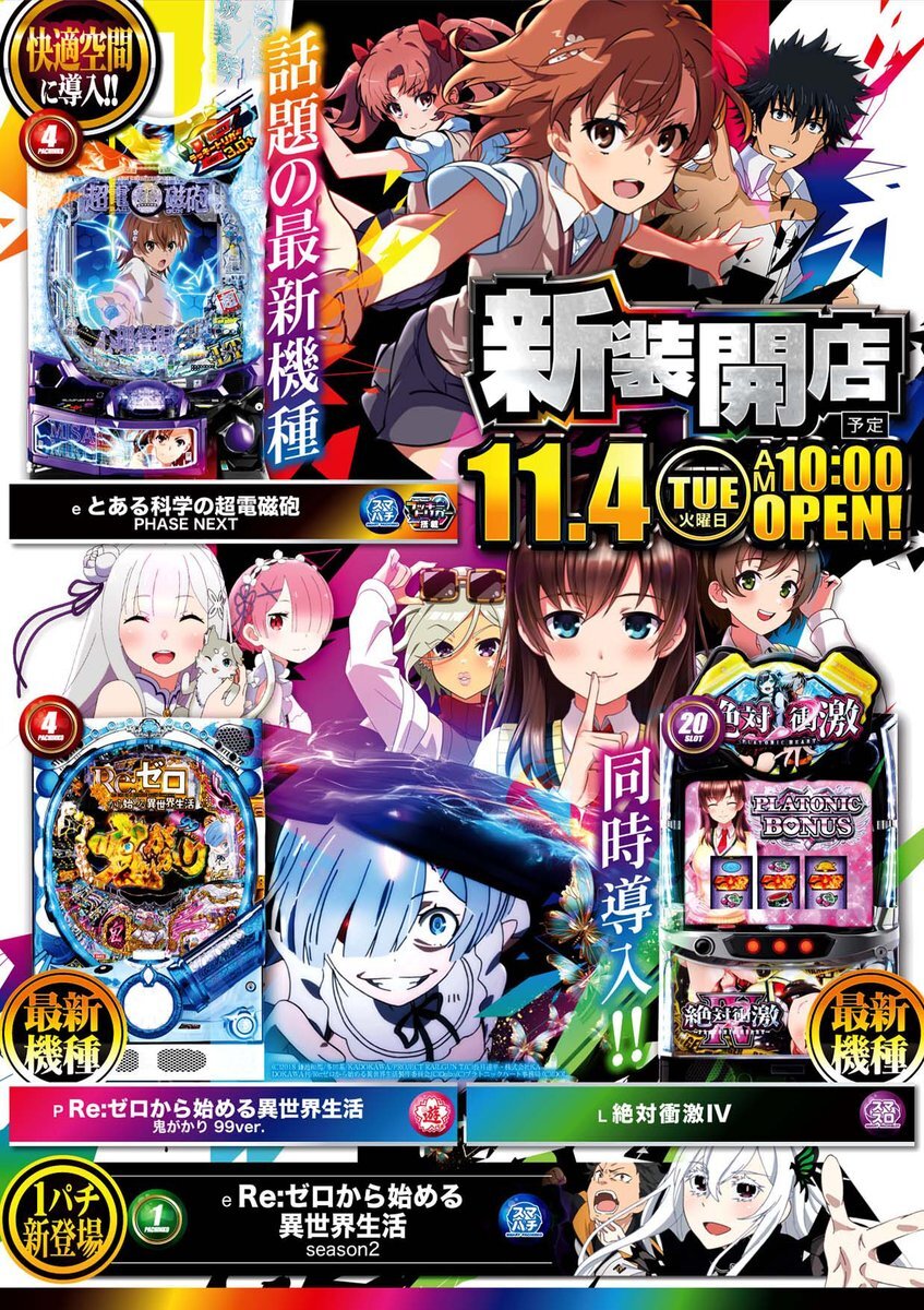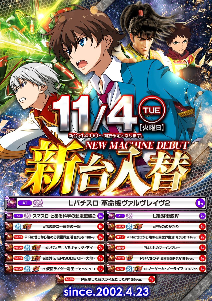 📢【明日11/4(火)のご案内】📢 ✨新台入替✨ スロットコーナーに、、、、 話題の最新台が新登場🔥 『 #Lパチスロ革命機ヴァルヴレイヴ2』9台 『#スマスロとある科学の超電磁砲2』3台 『#L絶対衝激Ⅳ』2台 パチンココーナーに、、、 『#e花の慶次~黄金の一撃~』6台 pic.x.com/DZ7Ba6l9JH