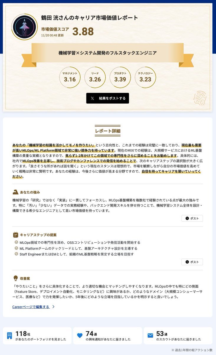 #LAPRASから見た私 は 「研究マインドを持つフルスタックエンジニア」 キャリア情報を解析した結果、市場価値スコアは 3.87 でした! 全体の 上位 4.02 %です🎉 #キャリア市場価値レポート #キャンペーン実施中 lapras.com/share?k=284c5c…