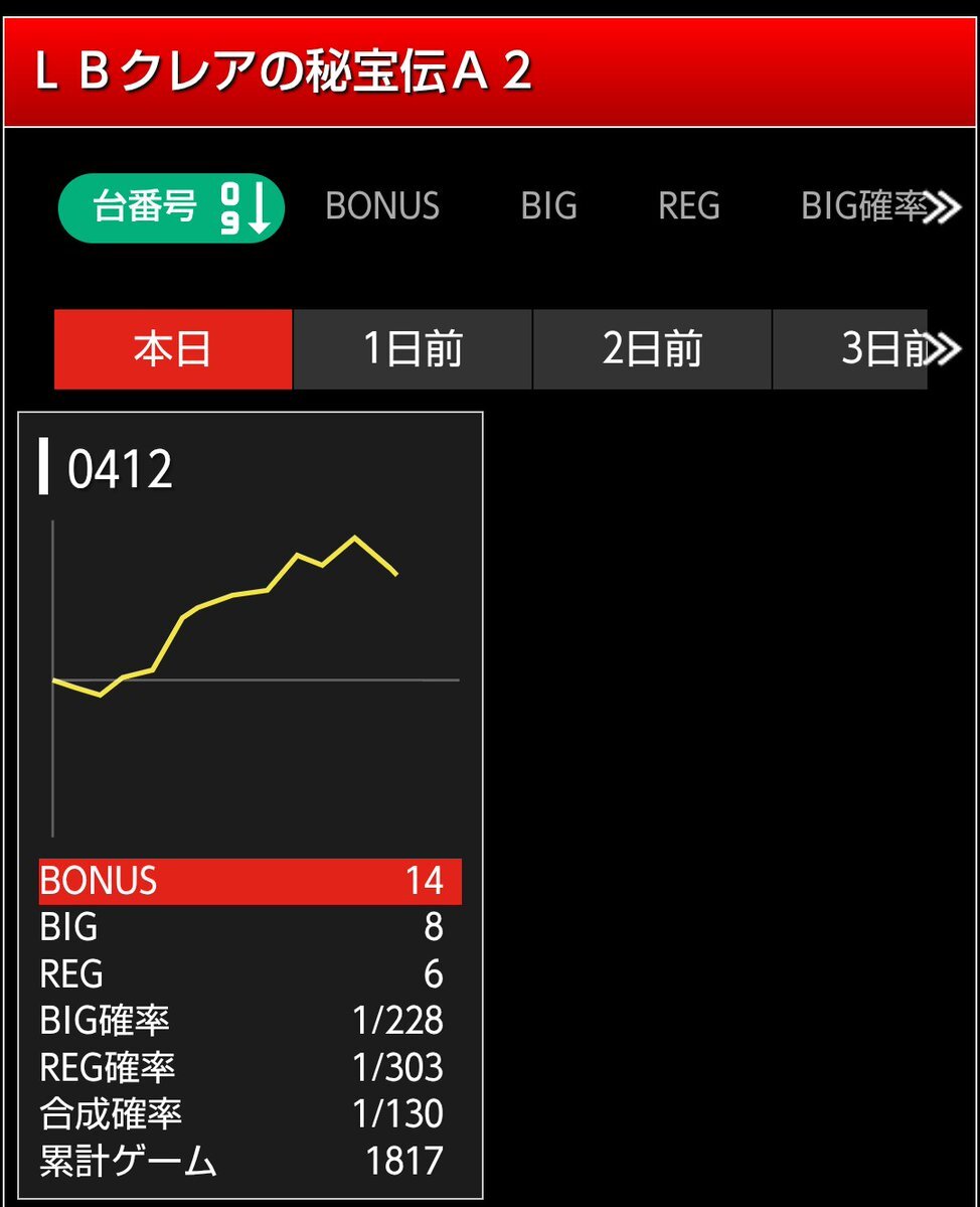 久しぶり(6日ぶり)のクレア 短時間しか打ってないから 何とも言えないけど小役確率と チェレグ3回を考えるともしかしたら… まぁ設定関係なくクレアは楽しいけどね☺️ 中間以下だと経験上ここから 一旦下山するハズだから 後で見てみよっと♪ #LBクレアの秘宝伝