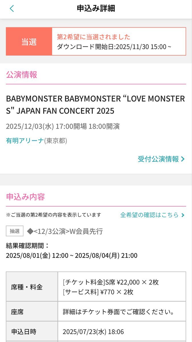 やばーーーい!!!取れた😭💕😭💕😭💕😭💕😭💕前回リハ入られへんかったから嬉しいまじで楽しみお見送りもあるか分からんけどあったら絶対に当てたい😭😭😭‼️‼️同じ日入る子居たら楽しもうねあと2ヶ月🎵🎵🎵 #BABYMONSTE #LOVE_MONSTERS pic.x.com/6lffB3CCAs