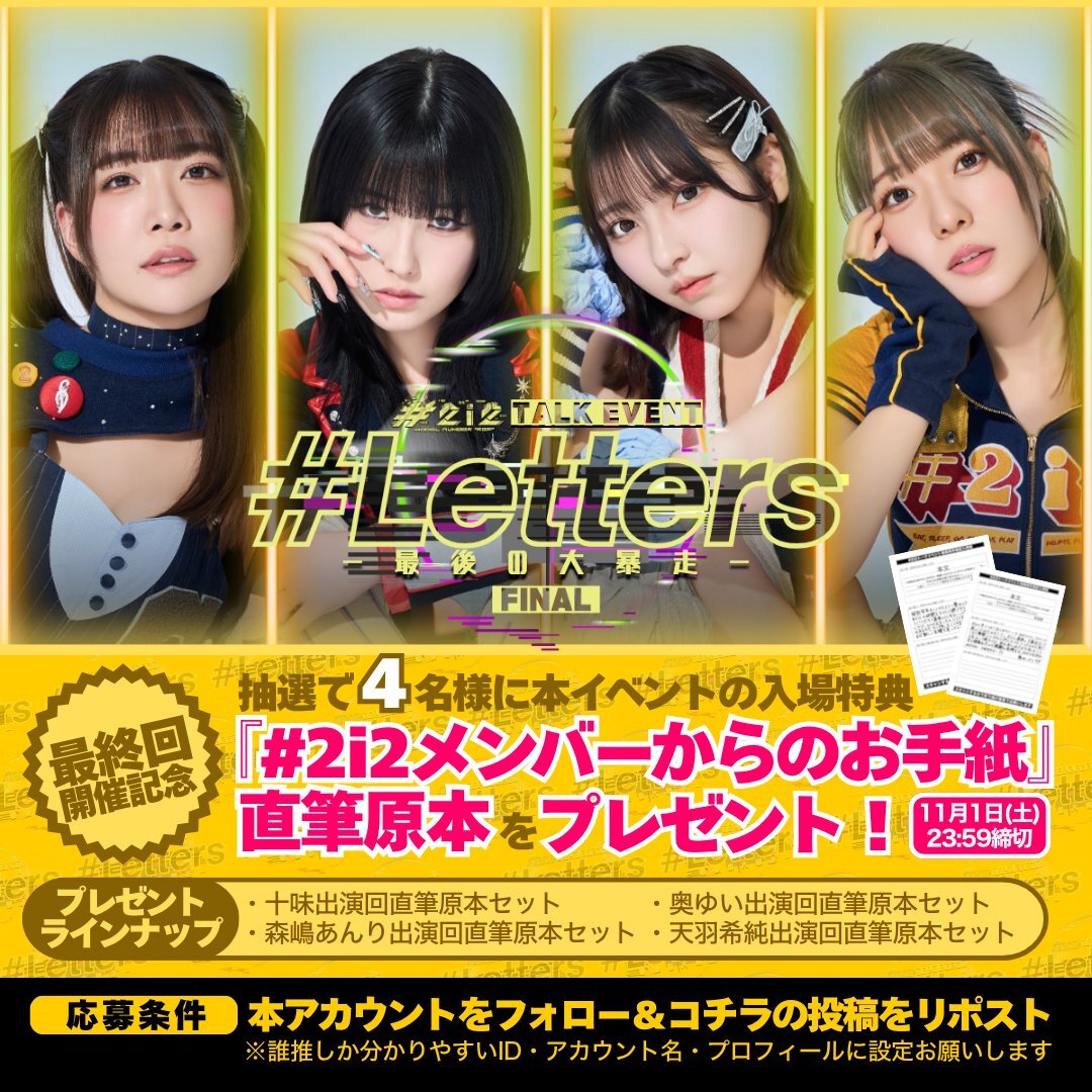 #2i2 TALK EVENT 「#Lettersー最後の大暴走ー」FINAL 開催決定& 記念フォローリポストキャンペーン🤖 \ 📅11/2(日) 🎪会場:快・決いい会議室HALL A ⏰OPEN18:30 / START18:45  ▼詳細・ご予約はコチラ t.livepocket.jp/e/letters_final フォローリポスト企画の詳細は リプライ欄にて👇 pic.x.com/B7GOFn4h7e