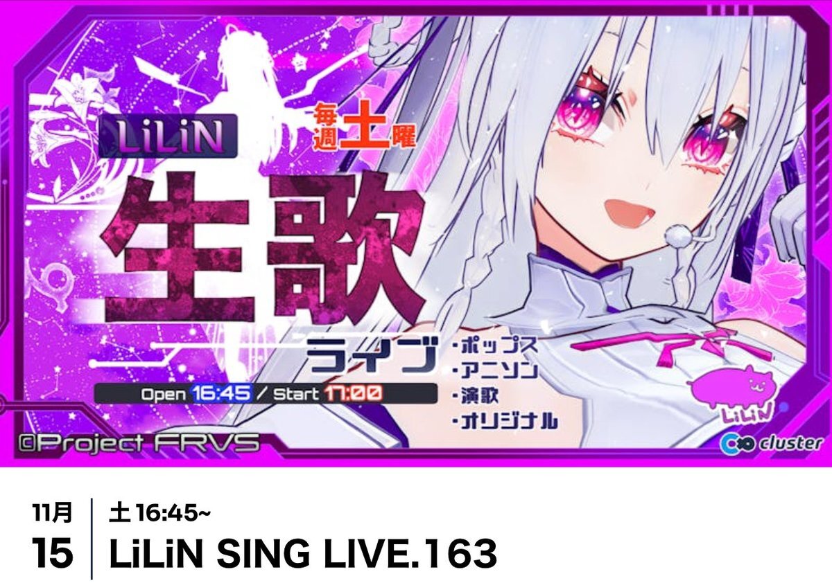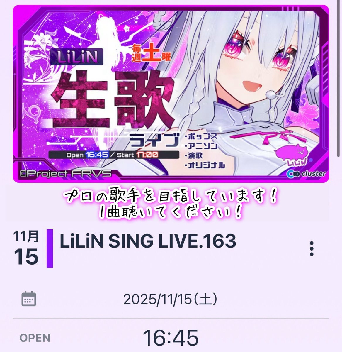 【#LiLiNclusterLIVE】 《LiLiN SING LIVE.163》 🗓11/15(土) op 16:45/st 17:00 🎪➡︎ cluster.mu/e/88e6e129-6bb… #マクロス の歌姫を プロの歌手を目指し歌う #Vsinger です🎙 「#cluster 始めてみたけど…どこで何すればいいの🥺?」 という方もお気軽にお越しください🔰🫶🏻 #ProjectFRVS #VR