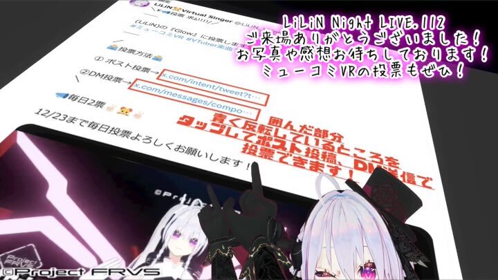土曜日ライブへのご来場ありがとうございました! 本日のお写真や感想を #LiLiNclusterLIVE と一緒に、SNSやnoteに投稿いただけたら嬉しいです! ミューコミVRの投票もよろしくお願いいたします!!!!!!! 📯詳細はコチラ→ x.com/lilin_vsinger/… #cluster #Vsinger #VR pic.x.com/gjTGJDADIj x.com/LiLiN_Vsinger/…