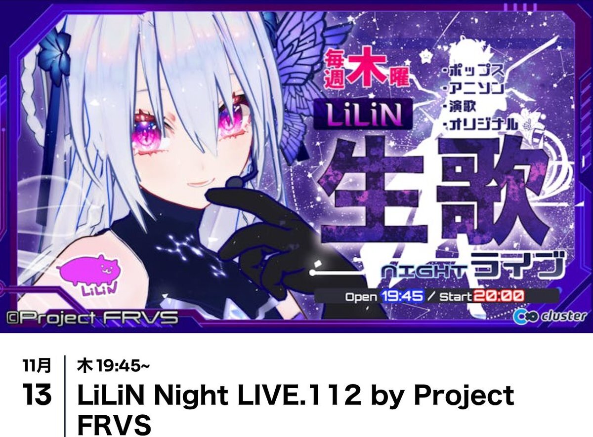 【#LiLiNclusterLIVE】 《LiLiN Night LIVE.112》 🗓11/13(木) op 19:45/st 20:00 ➡︎cluster.mu/e/17c436aa-dc2… マクロスの歌姫を、プロの歌手を目指し活動している #Vsinger です🐹 #歌声が好みって人にフォローされたい! スマホからもアクセスできるバーチャルライブです! #cluster #ProjectFRVS