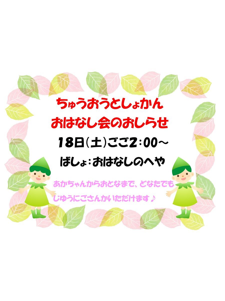 【中央図書館:おはなし会のお知らせ】 来週のおはなし会の日程を、以下の通りお知らせいたします。 10/18(土)午後2時~ としょかん 事前予約は不要です。お気軽にご参加ください。 #丹波篠山 #丹波篠山市立中央図書館 #library #おはなし会 #絵本 #赤ちゃんから大人までどなたでもどうぞ! pic.x.com/KPUwCbX8fs