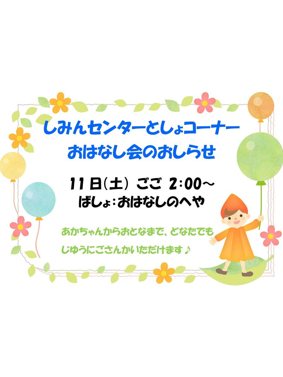【市民センター図書コーナー:おはなし会のお知らせ】 今週のおはなし会の日程を、以下の通りお知らせいたします。 10/11(土) 午後2時~ としょかん 事前予約は不要です。お気軽にご参加ください。 #丹波篠山 #丹波篠山市民センター図書コーナー #library #おはなし会 pic.x.com/9k8yxmxrDt