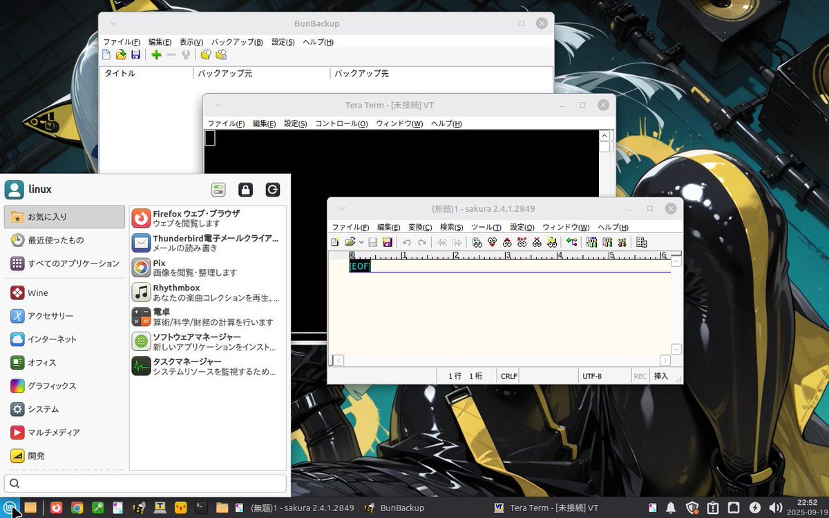 #LinuxMint #Windows10サポート終了 LinuxMintでWindowsで使っているアプリの起動実験…サクラエディタ 2.4.1、BunBackup 6.11、TeratermPro 5.5.0は動作できた。 Windows10終了までには間に合うかな…使いなれたアプリ動かせるようにしたい... pic.x.com/CniM2DU8pb