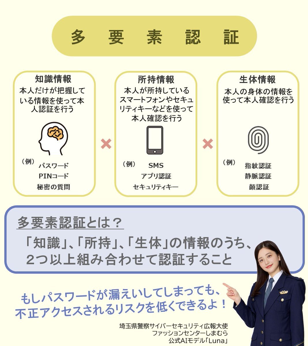 ⭐️Lunaメモ⭐️ 認証方法はパスワード以外にも、顔認証やアプリ認証など色々あります! #多要素認証🔑は知識・所持・生体の情報うち、2つ以上を組み合わせて認証する方法です🗝 ログインに必要な情報が増えるので、不正アクセスのリスクを低くできるよ✌ 認証を強化してアカウントを守ろう! #Lunaメモ pic.x.com/2J9mMOmqCS