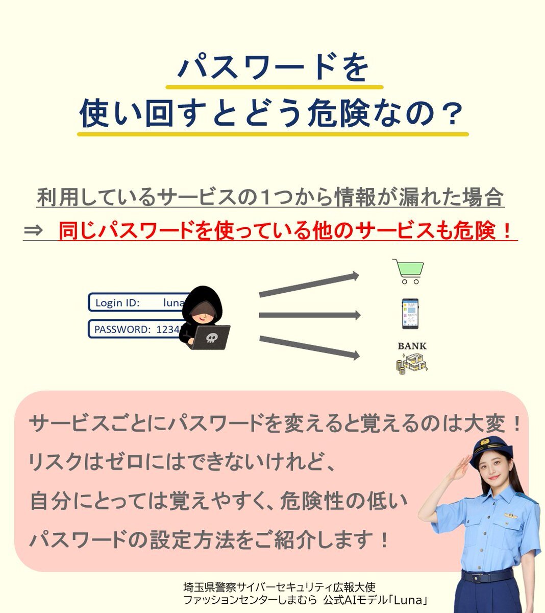 ⭐️Lunaメモ⭐️ パスワードの使い回しは危険だっていうけれど、サービスごとに違うパスワードを設定するのは大変😰 リスクをゼロにはできないけれど、自分にとっては覚えやすく危険性の低いパスワードの作り方を教えます✌ サービスごとにパスワードを設定して、安全にアカウントを利用しよう #Lunaメモ pic.x.com/kaKYWmtEmY