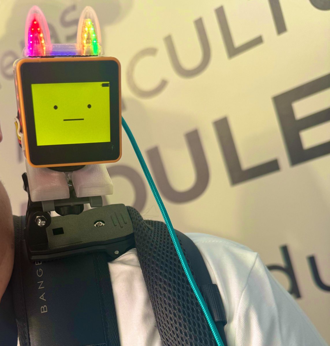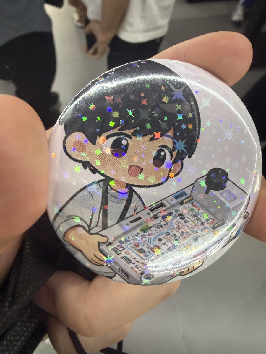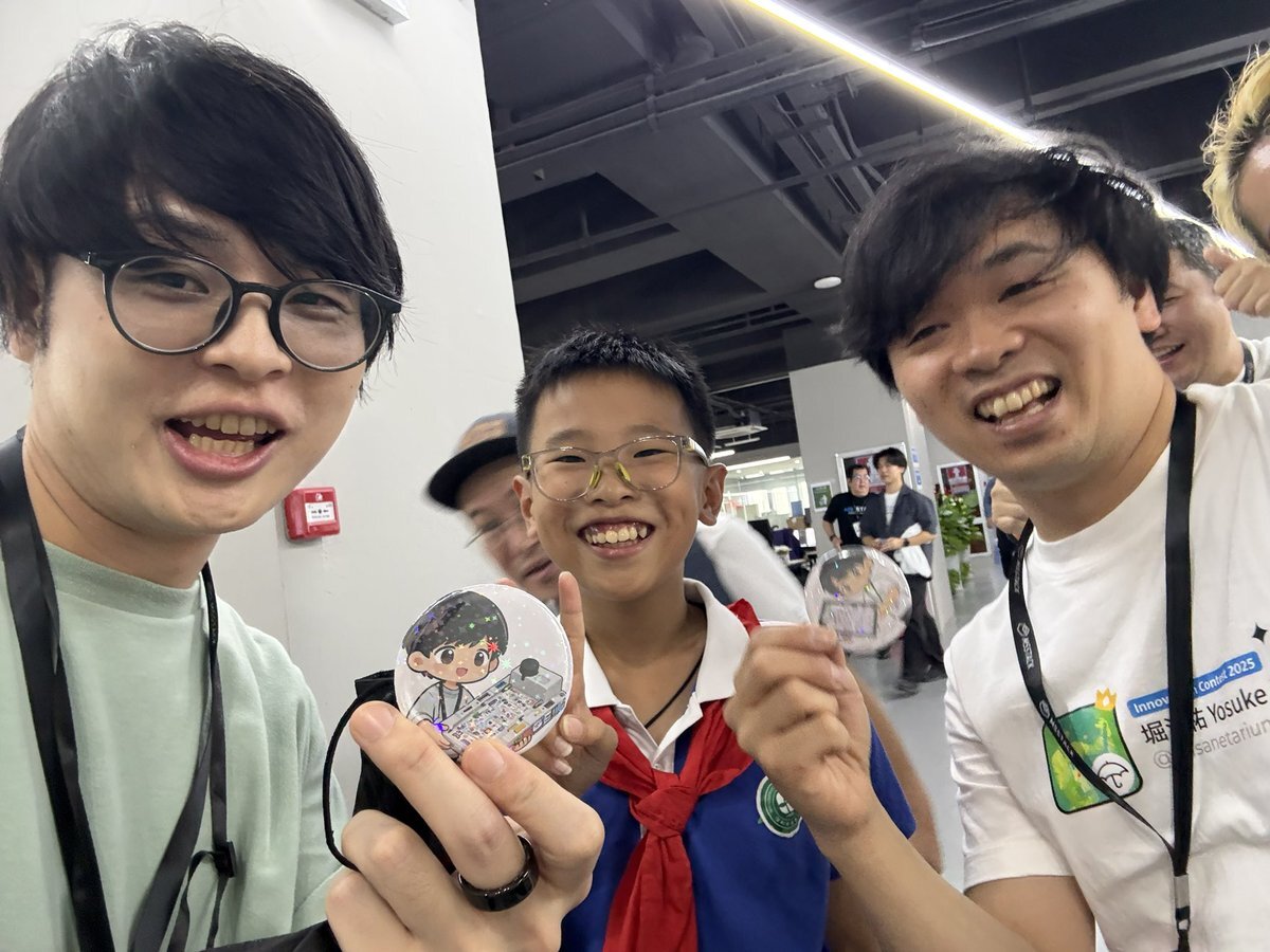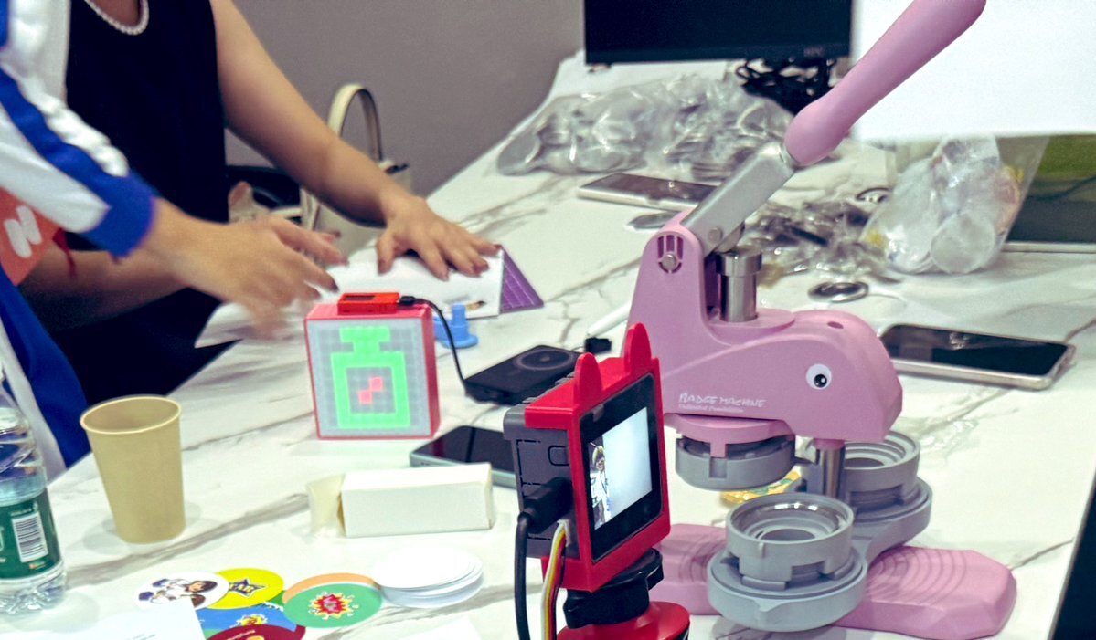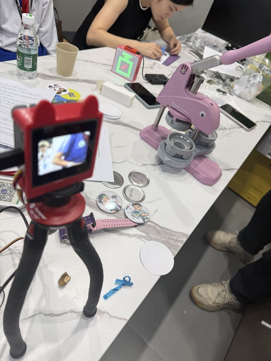 子供たちがM5Stackで作ったカメラで缶バッチ制作してくれた! 写真を撮って画像生成した絵を元に缶バッチ作ってくれて(人間が)ダンスまで思ってくれる #M5Stack pic.x.com/qoMzUBvPad