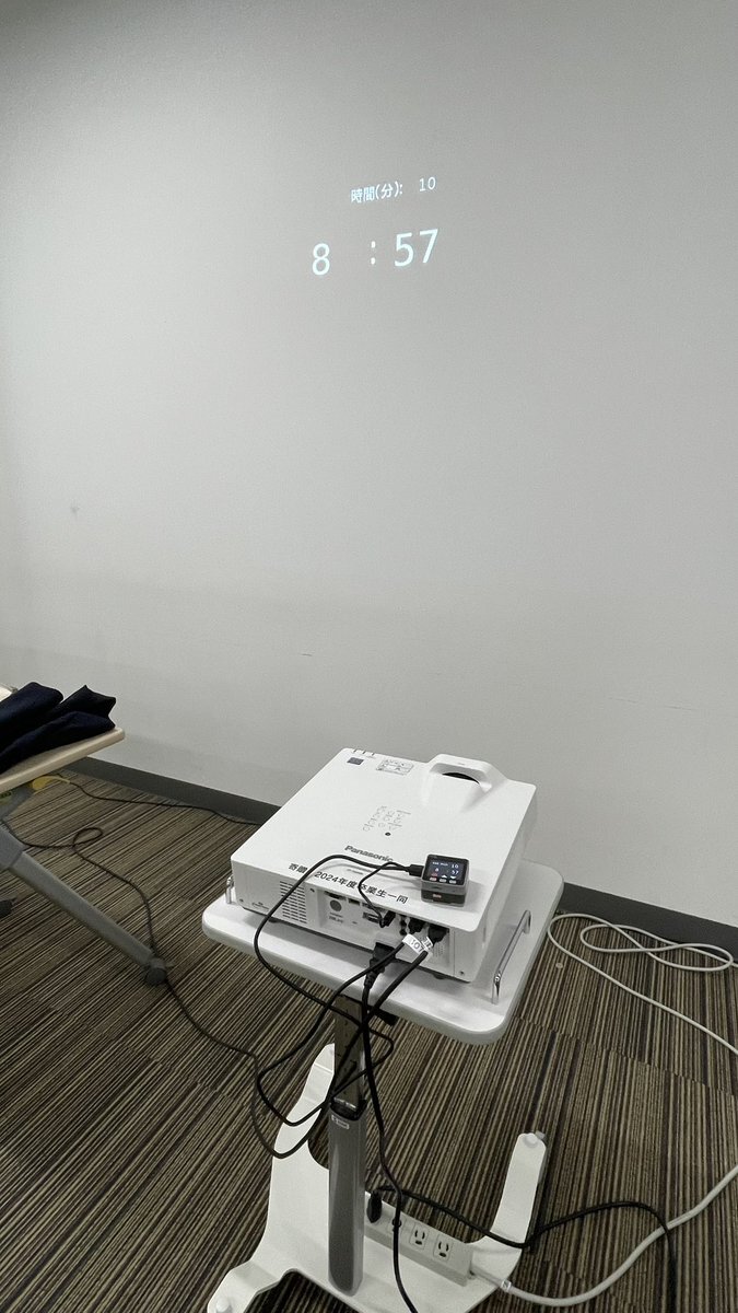 プロジェクターに繋いでみた。USBが付いてるプロジェクターなら、電源をプロジェクターから取れるのでスッキリ。スタート、ストップ、分だけ変更。のシンプル設計。 #M5Stack pic.x.com/Xt8LHGn1HY
