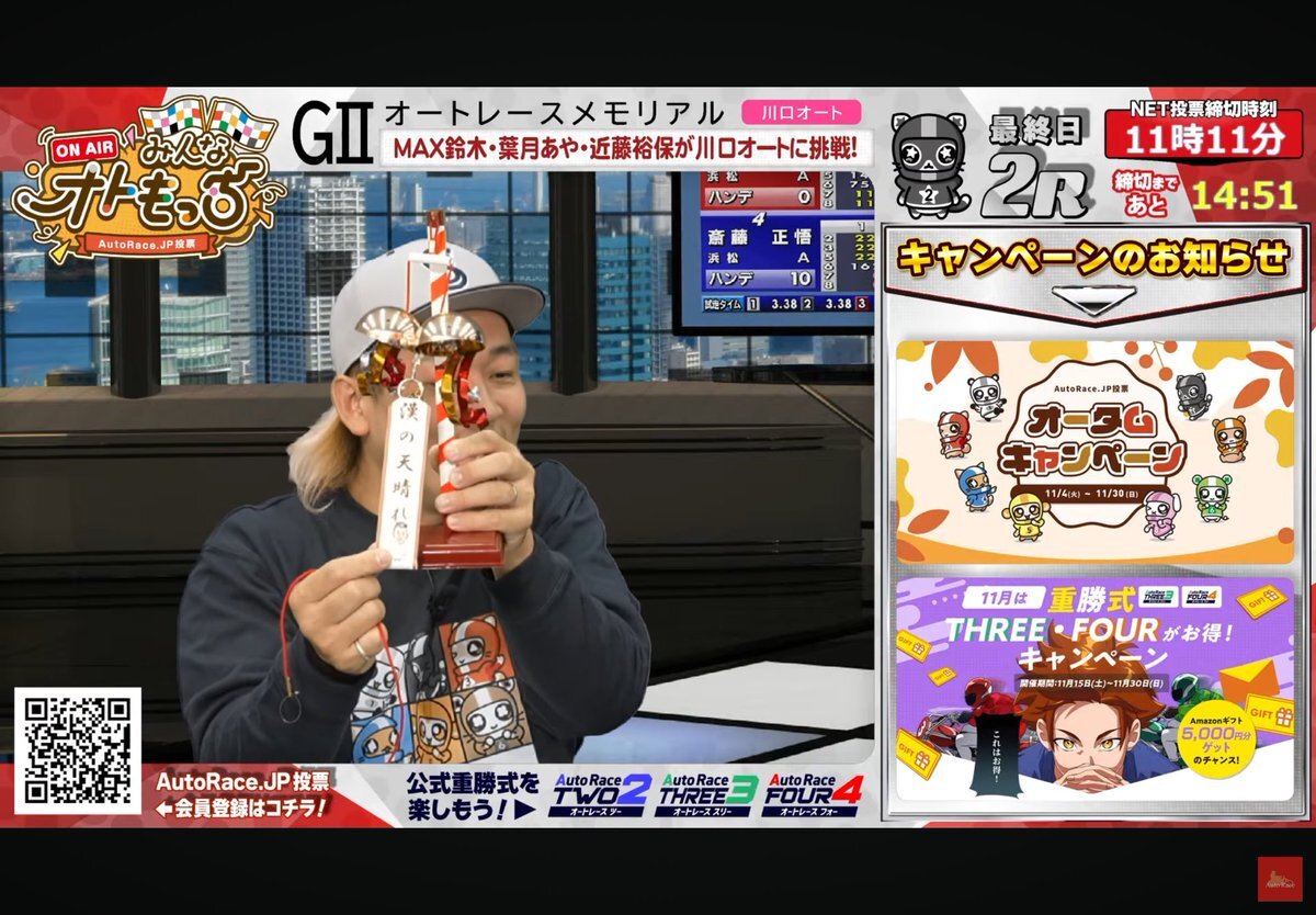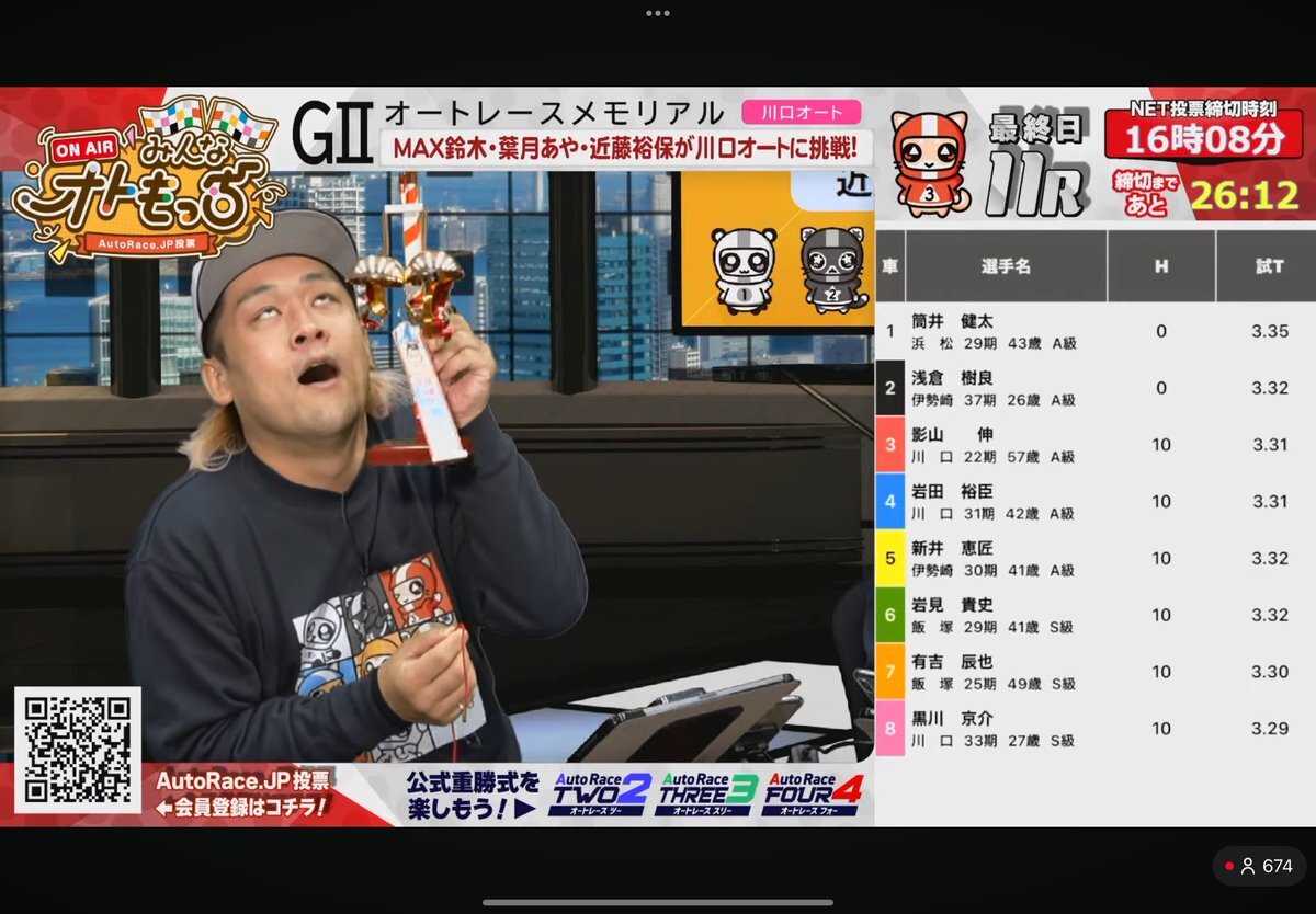 川口G2メモリアル最終日🏆 #みんなオトもっち 放送開始📣 出演者の中で、収支額が一番多いのは誰だ!? あなたの予想が当たれば… 抽選で20名様にクオカードセットプレゼント🎁 #MAX鈴木 さん #葉月あや さん #近藤裕保 さんでお送りします 視聴はこちらから☟ youtube.com/live/1rjR2_Na5… #オートレース