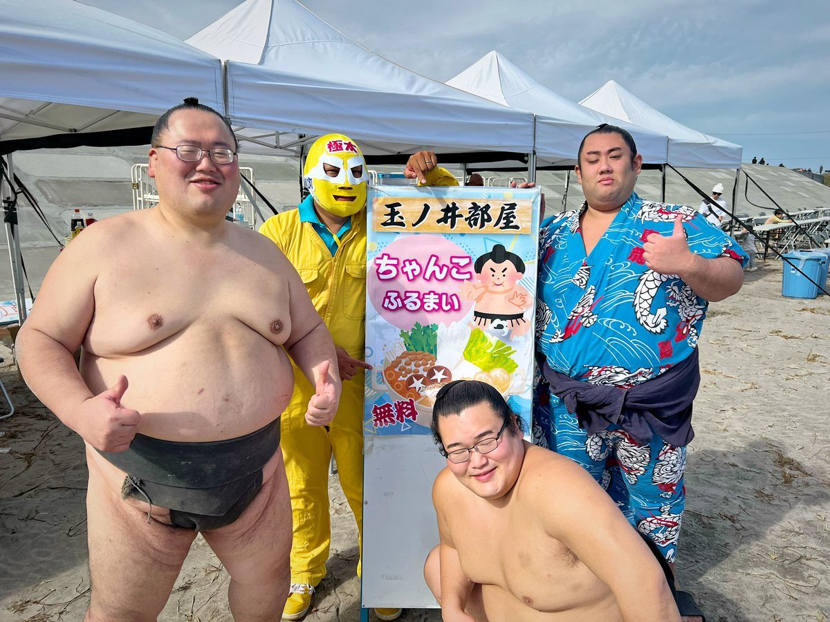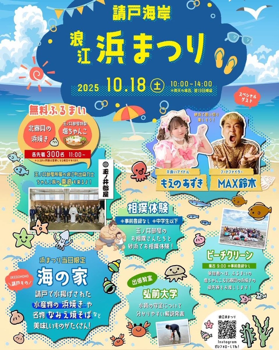 【あしたは『 #浪江浜まつり 』⛱️】 みんな~ あしたは #請戸海岸 に遊びさおいで✨️ 大相撲玉ノ井部屋の塩ちゃんこ鍋を先着300人に無料ふるまい🍲 ちゃんこ長で浪江出身の力士・東浪さんも来てくれるよ✨ #浪江町 #浪江浜まつり #玉ノ井部屋 #東浪 #もえのあずき #MAX鈴木 #うけどん pic.x.com/XyT2lkOMgs