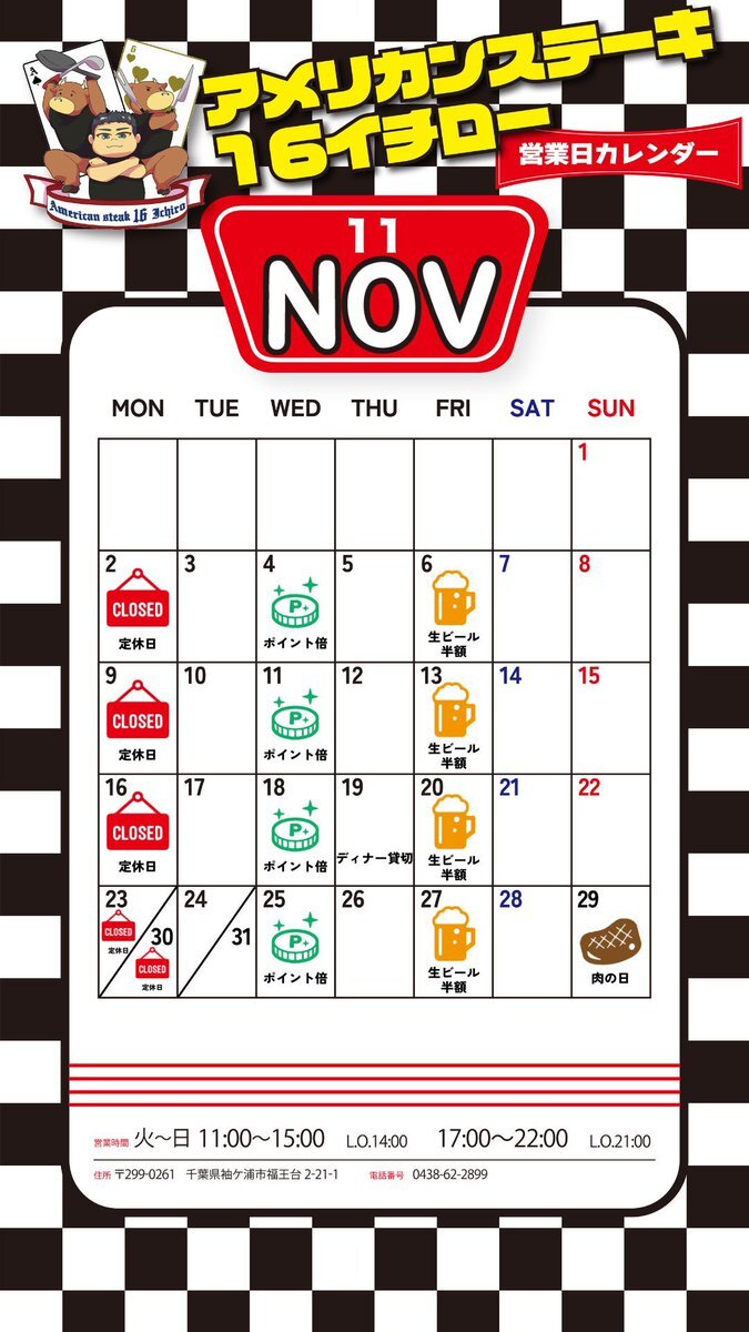 11月の営業日カレンダーです 臨時休業はありません あ〜もう年末だ〜 後もう少しよろしくお願いします アメリカンステーキ16イチロー 0438-62-2899 #ダイナー #アメリカンダイナー #木更津ランチ #ステーキ #ペルー料理 #メキシコ料理 #安い #美味しい #デカ盛り #デカ盛りハンター #MAX鈴木 pic.x.com/oGYrdz0dnW
