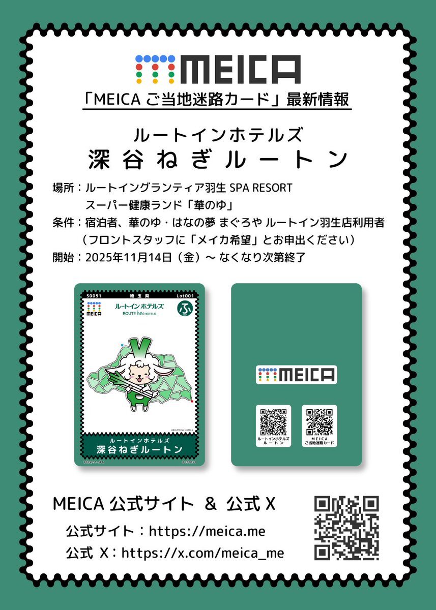 ご当地ルートン第2弾 深谷ねぎルートン #MEICAカード 埼玉県民の日に誕生しました! ルートイングランティア羽生でMEICAゲットだぜ👍✨ たくさんゲットしてもらえると、全国のご当地ルートンMEICA誕生につながると思いますのでぜひ🙏
