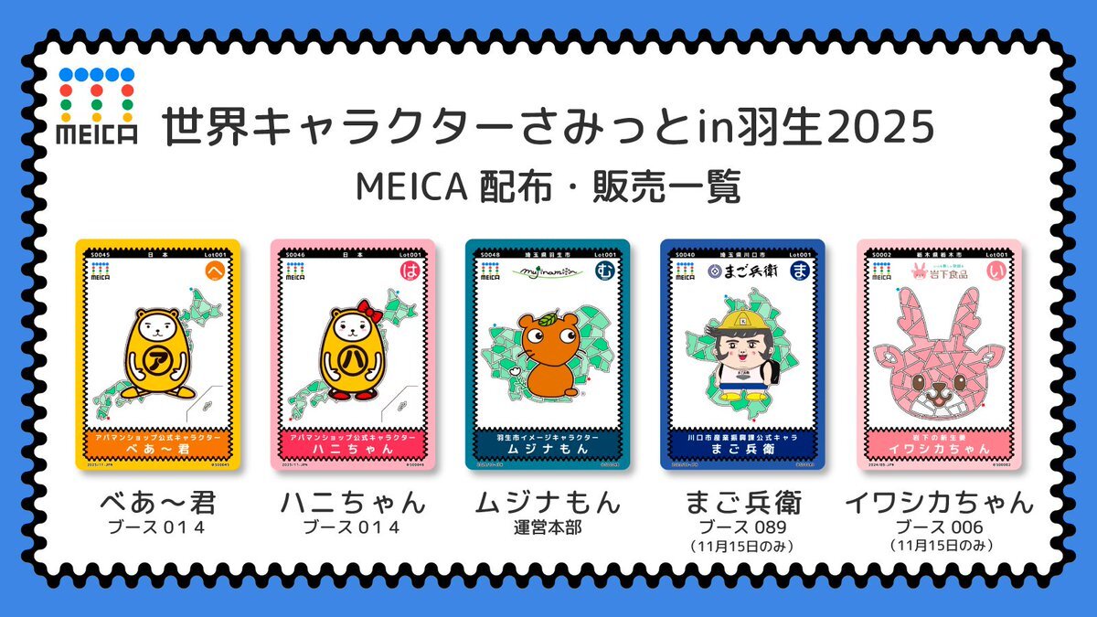 11月15日・16日開催「世界キャラクターさみっとin羽生」で5つの #MEICAカード が登場! ①べあ〜君 ②ハニちゃん ③ムジナもん ④まご兵衛(15日のみ) ⑤イワシカちゃん(15日のみ) コンプリートできるかな? #はにゅはにゅ pic.x.com/zfiDTrey9d