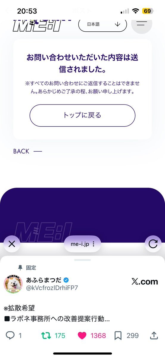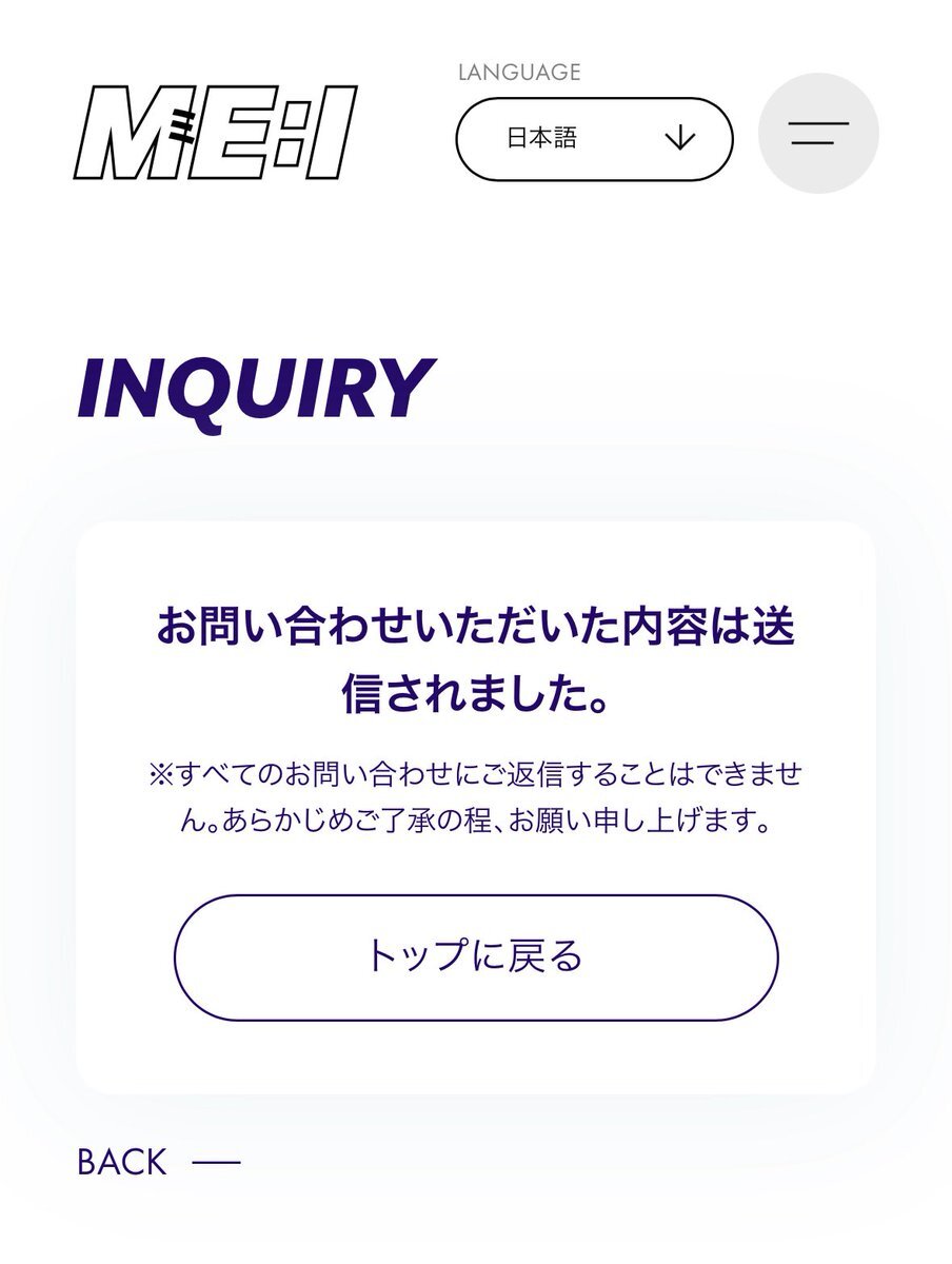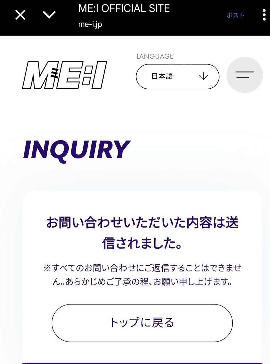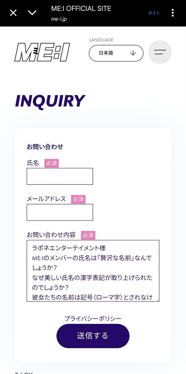 □改善提案を窓口に送信してきました。 タグをつくりましたので声かけをしあいましょう。 #ME_I_氏名漢字表記改善提案 ※拡散希望 ■ラポネ事務所への改善提案行動 ■日時:11月24日(月・振休)18時から翌日6時まで推奨 ■提案窓口:ME:I「INQUIRY」 me-i.jp/feature/inquiry pic.x.com/te3GyvFGtB