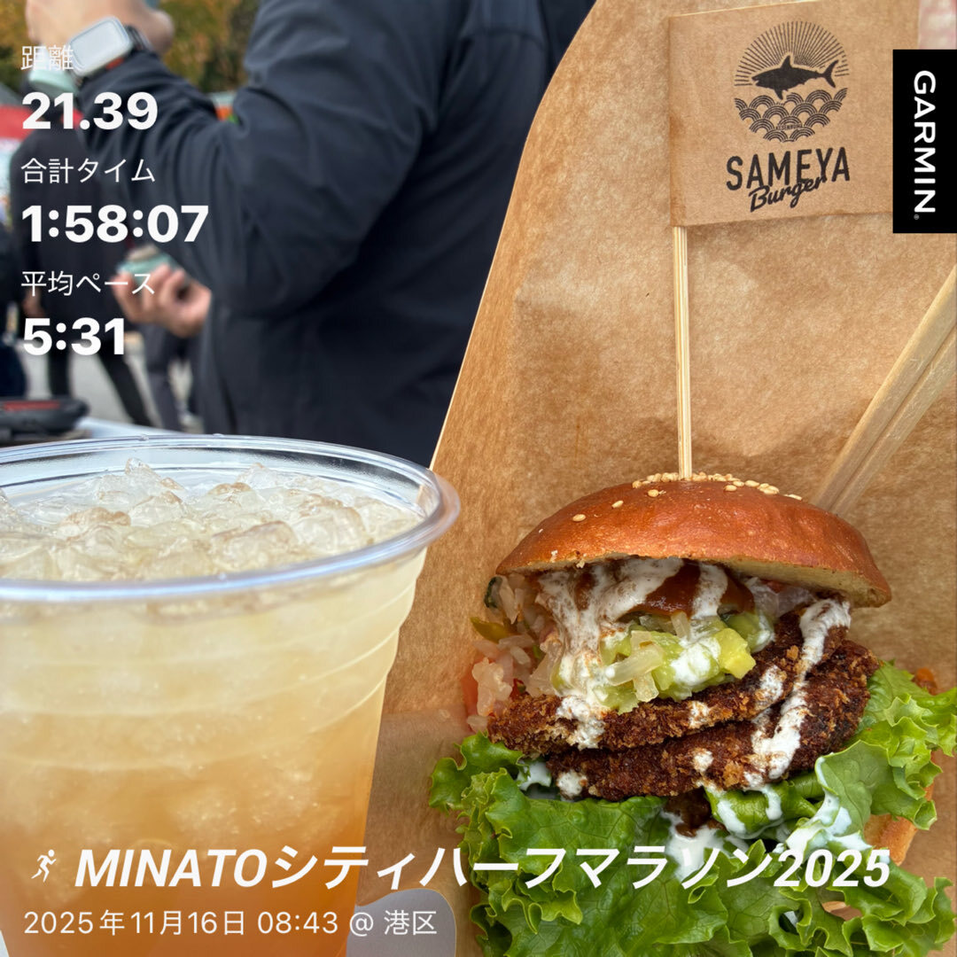 無事に完走〜🏃♀️🏅✨ 気温も風もちょうど良くて気持ちよかったです🍂 カンパーイ🍻✨ #ありがとう #MINATOシティハーフ #気仙沼サメバーガー #ジンジャーハイボール pic.x.com/bHSuHC7RSV