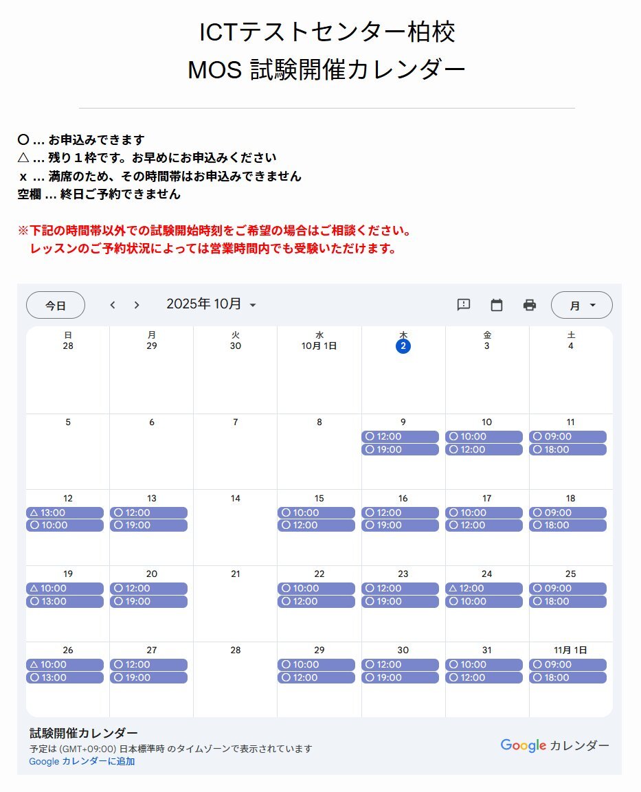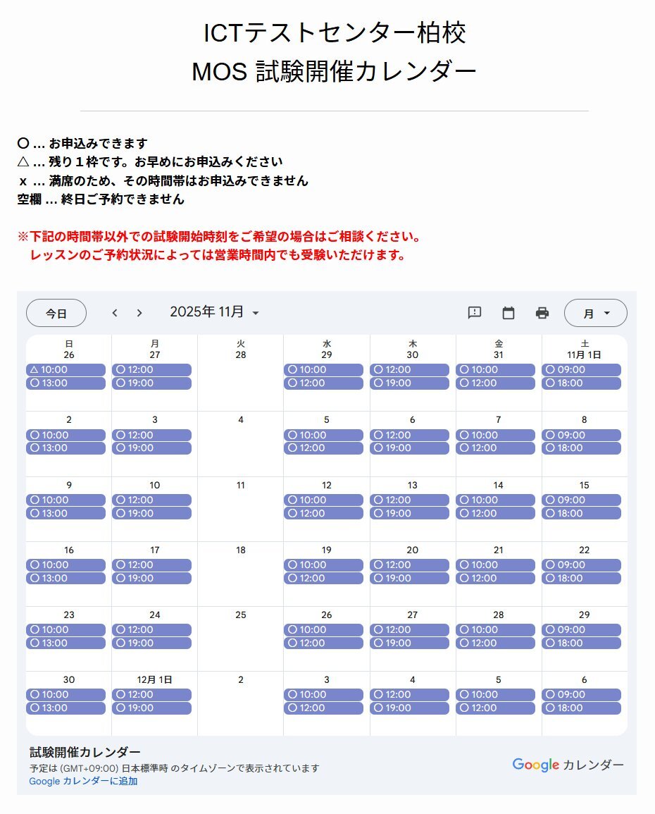当会場での11月分の試験申込を開始しました。 定休日の火曜以外は毎日受験いただけます👍 日商簿記検定の2級と3級は施行休止期間があります。 下記の10日間はネット試験が受験いただけませんのでご注意ください! ▶️11月10(月)~19日(水) #ICTテストセンター柏校 #MOS試験会場 pic.x.com/KDqHTSRhod