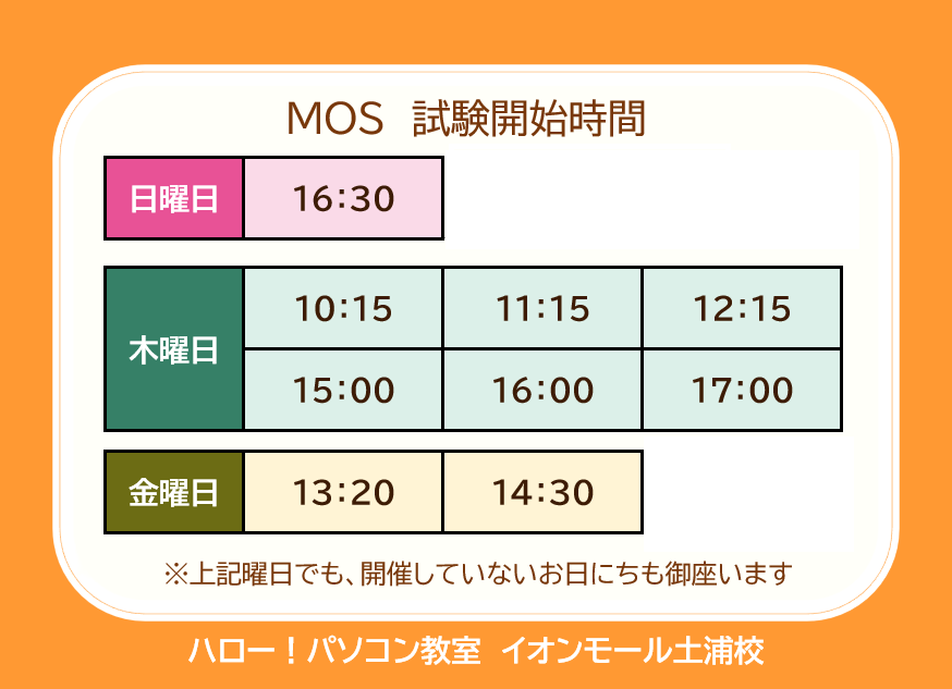 #MOS試験 開催時間一覧】 ⭐空席状況はお問い合わせください☎ ⭐お申込みは教室にご来室を♪ ⭐開催していないお日にちも御座います #パソコン教室 #イオンモール土浦 #土浦イオン #MOS #MOS試験会場 #MOS365 pic.x.com/ZYFjYOeVHN
