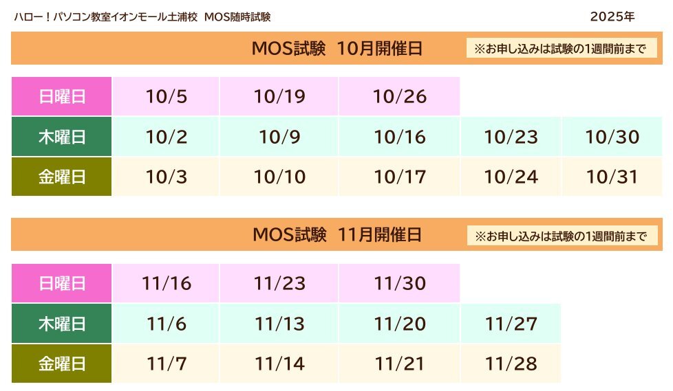 #MOS試験 試験日一覧】 ✏空席状況はお問い合わせください☎ ✏お申込みは教室にご来室を♪ ✏試験時間は開催日によって異なります #パソコン教室 #イオンモール土浦 #土浦イオン #MOS #MOS試験会場 #MOS365 pic.x.com/es8Gbs3UQ2