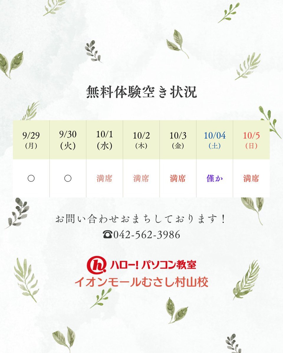 こんばんは。来週の無料体験予約の空き状況になります。予約はお早めにお願いたしますね! 無料体験予約はこちらから→murayamapc.net/taiken/ #パソコン教室 #武蔵村山 #イオンモールむさし村山 #MOS資格 #プログラミング #Scratch #スマホ #タブレット #起業 #自営 pic.x.com/Oq3OFplmoz