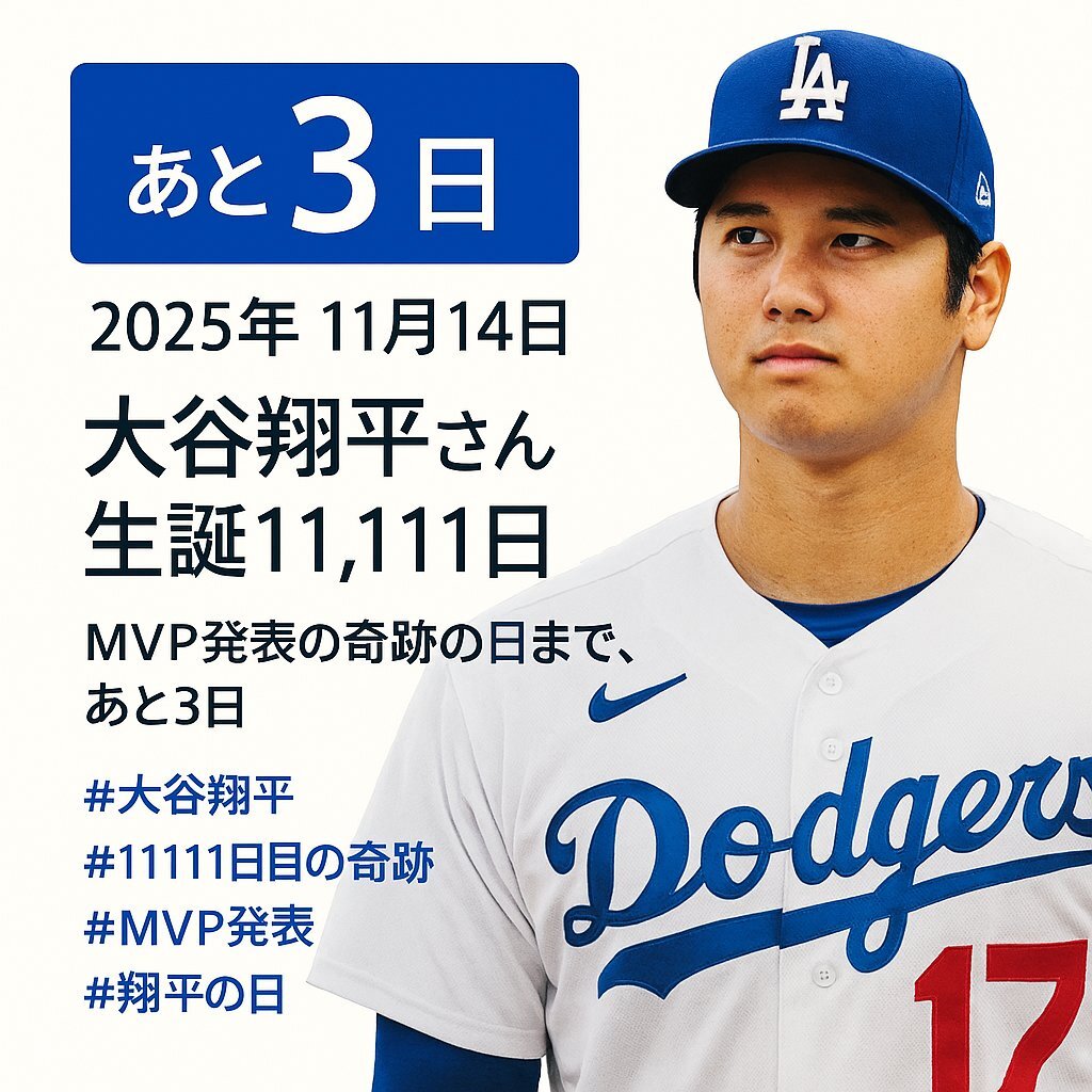 翔平さんが生まれてから11,111日目まで、あと3日✨ その日はMVP発表の日でもあります。 努力と夢が重なる奇跡の瞬間が、もうすぐやってくる。 #大谷翔平 #11111日目の奇跡 #MVP発表 #翔平の日 #ドジャース応援団 pic.x.com/JK1HcfLyM7