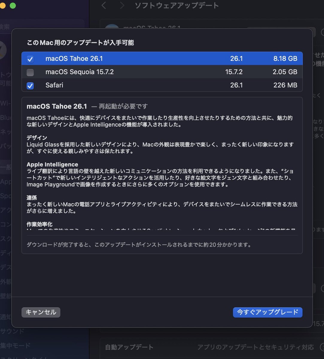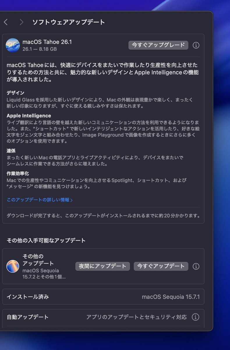 Tahoe(macOS26)にはまだしないので Sequoia(macOS15.7.2)だけ行おうと思ったら「その他1個のアップデート?」 はて?インフォメーションを覗いてみたら おいおい、勝手にTahoe26.1にチェックされてる∑(゚Д゚) 危うくトラップにハマるとこでした💦 Tahoeくん様子見の方は注意して下さいね #macOS pic.x.com/RaYh31Td09