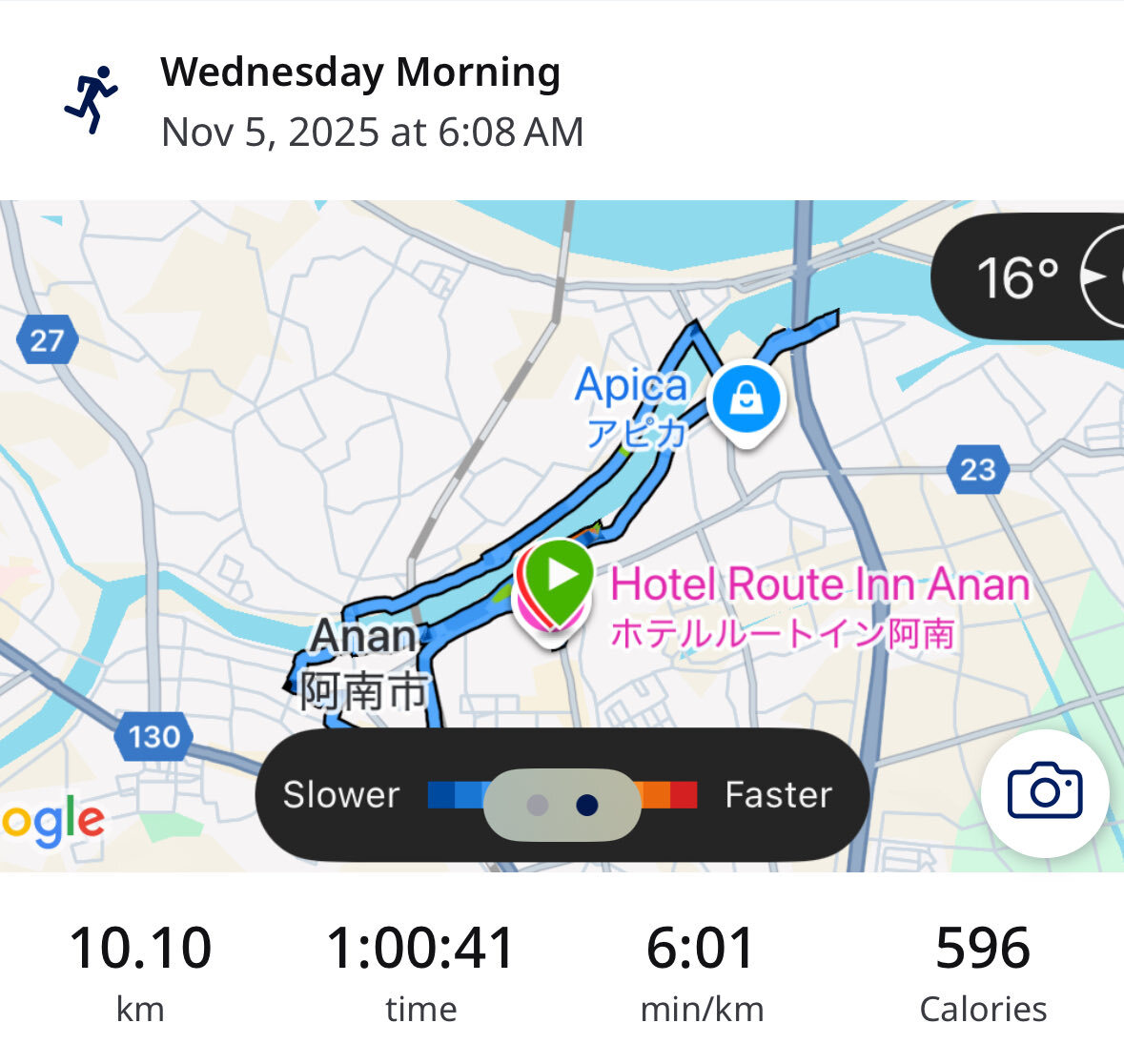 昨日は羽田✈️経由で徳島に移動🛬、からの... 今朝は気温15℃ 湿度82% 曇天☁️の下、出張ラン10.10km♪ “光のまち💡”阿南市内&桑野川の堤防を散策ジョグ🏃‍♂️💦 最後にショートインターバル200m×5本💨 #ASICS #MagicSpeed2 👟 #朝ラン #ランニング #走れることに感謝 #RunToFeel pic.x.com/jDA7xALztN