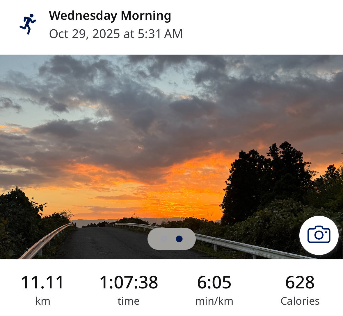 今朝は気温5℃ 湿度84% 朝焼け🌄の中、朝ラン11.11km♪ “クマップ🐻”(熊出没情報)をチェックしてから、ショートインターバル200m(Rest200m)×20本🏃💨(40”設定) せいぜい時速20㌔なので、時速50㌔以上と言われる熊からは到底逃げられない😇 縄跳び💯回+二重跳び 3+11+22回 #ASICS #MagicSpeed2 👟 pic.x.com/5FwhyCBOdW